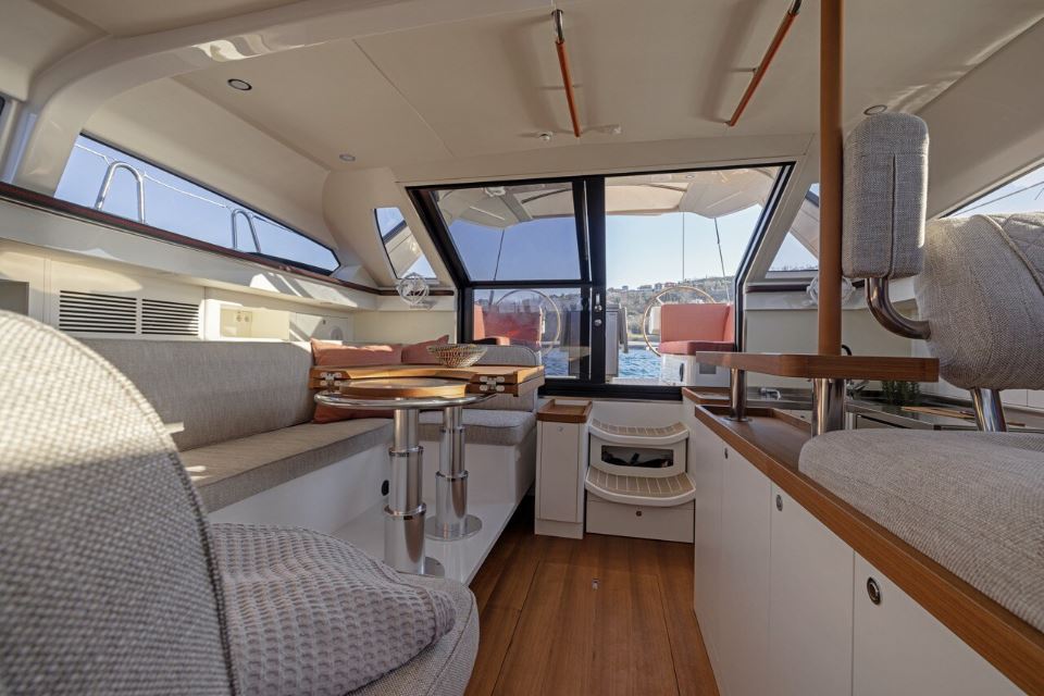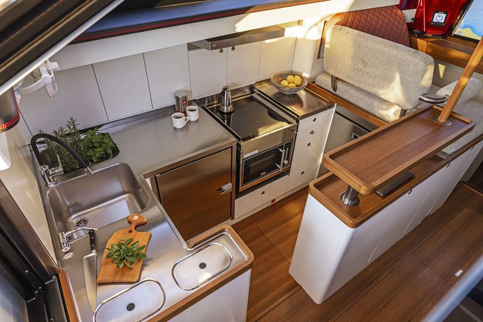 Interior layouts consider conditions at sea and provide support for safe movements and comfortable seating and resting. Dedicated storage space in the galley for needed cutlery and throughout the yacht for food and other necessary equipment is carefully planned with inputs from ocean goers.