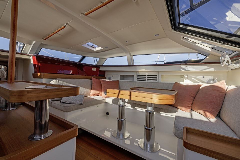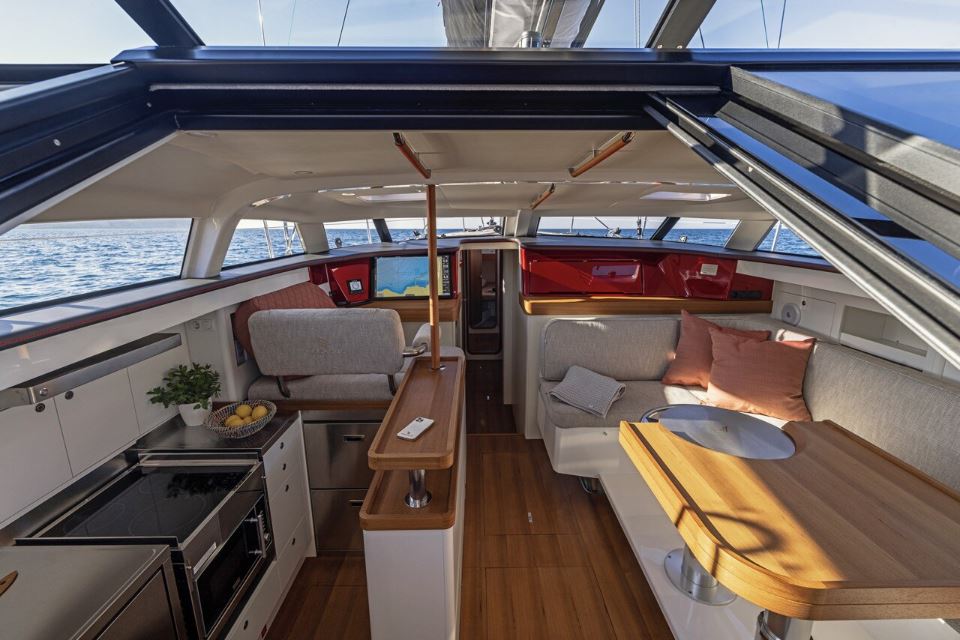 The uniquely connected living spaces offer open-plan living while remaining safe and secure at sea. Innovative features include gimbaling seating in the saloon, carbon and composite construction to keep the yacht light and strong, an anchor launching system to prevent loads through the bowsprit, and many other clever design elements.