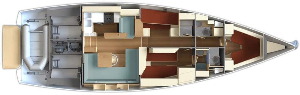 Reducing stress factors and improving control onboard is one of the main elements of the wellbeing of the owner and his crew. There are no big steps possible nowadays – instead smaller details that would support sailing operations and make sailing in various conditions controllable. The Pegasus 50 has a modern, well-balanced and full ends hull, which would support reaching performance but would be safe and comfortable in heavy wind upwind conditions if needed due to her high ballast ratio. The mast is moved maximum aft as practical. This gives more sail area to easy furl-able headsails. The boom is shortened for a purpose: to have as smaller a load on the mainsheet arch as possible, for construction and weight reasons and to avoid the boom hitting waves while sailing wide open for sailing downwind. This can be dangerous for breaking the boom or boom gooseneck. It is planned to have a furling boom, but equally good would be a solid, oversized lazy bag. The mast has an extended mast crane to add mainsail area for light wind performance. Sail area is moderate, in connection to stability, optimized for 10-20 knots of wind. From 15 knots on a self-tacking J2 and the first reef would be a comfortable upwind configuration. Outer sheeting points for J1 will be used while reaching. At TWS 20 knots/100 TWA, with full main and J1, autopilot ON, she will be touching 12.5 knots yacht speed; her owner reading books and having cold drinks from the cockpit table fridge. Sitting in shadow with the wind in their hair, of course. Downwind sails, Code 0 and asymmetric gennaker will be furling, using modern endless furling systems with torque rope.