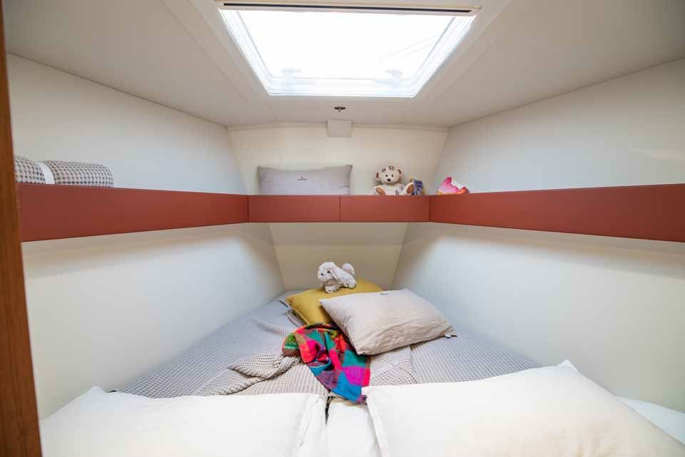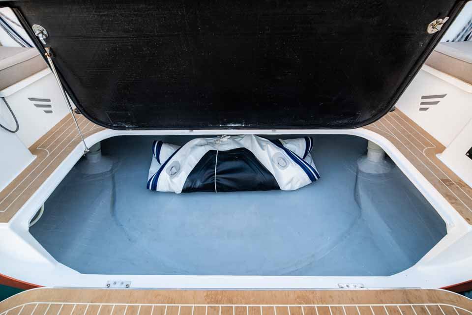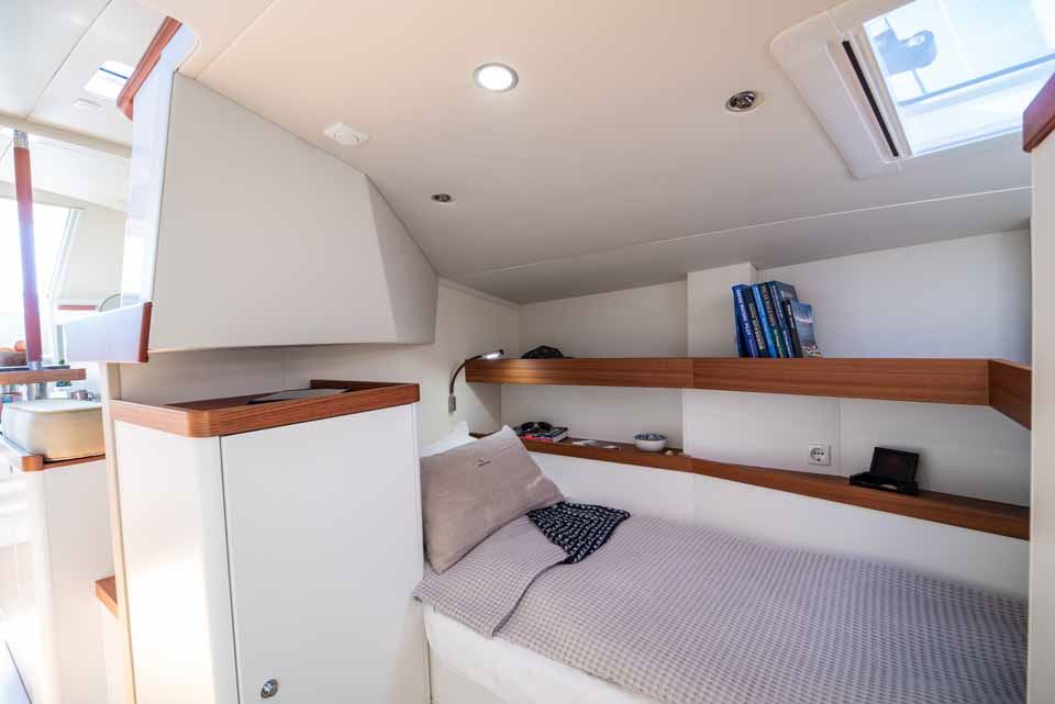 Reducing stress factors and improving control onboard is one of the main elements of the wellbeing of the owner and his crew. There are no big steps possible nowadays – instead, smaller details that would support sailing operations and make sailing in various conditions controllable. The Pegasus 50 has a modern, well-balanced, and full ends hull, which would support reaching performance but would be safe and comfortable in heavy wind upwind conditions if needed due to her high ballast ratio. The mast is moved maximum aft as practical. This gives more sail area to easy furl-able headsails. The boom is shortened for a purpose: to have as smaller a load on the mainsheet arch as possible, for construction and weight reasons and to avoid the boom hitting waves while sailing wide open for sailing downwind. This can be dangerous for breaking the boom or boom gooseneck. It is planned to have a furling boom, but equally good would be a solid, oversized lazy bag. The mast has an extended mast crane to add mainsail area for light wind performance. Sail area is moderate, in connection to stability, optimized for 10-20 knots of wind. From 15 knots on a self-tacking J2 and the first reef would be a comfortable upwind configuration. Outer sheeting points for J1 will be used while reaching. At TWS 20 knots/100 TWA, with full main and J1, autopilot ON, she will be touching 12.5 knots yacht speed: her owner reading books and having cold drinks from the cockpit table fridge. Sitting in shadow with the wind in their hair, of course. Downwind sails, Code 0 and asymmetric gennaker will be furling, using modern endless furling systems with torque rope.
