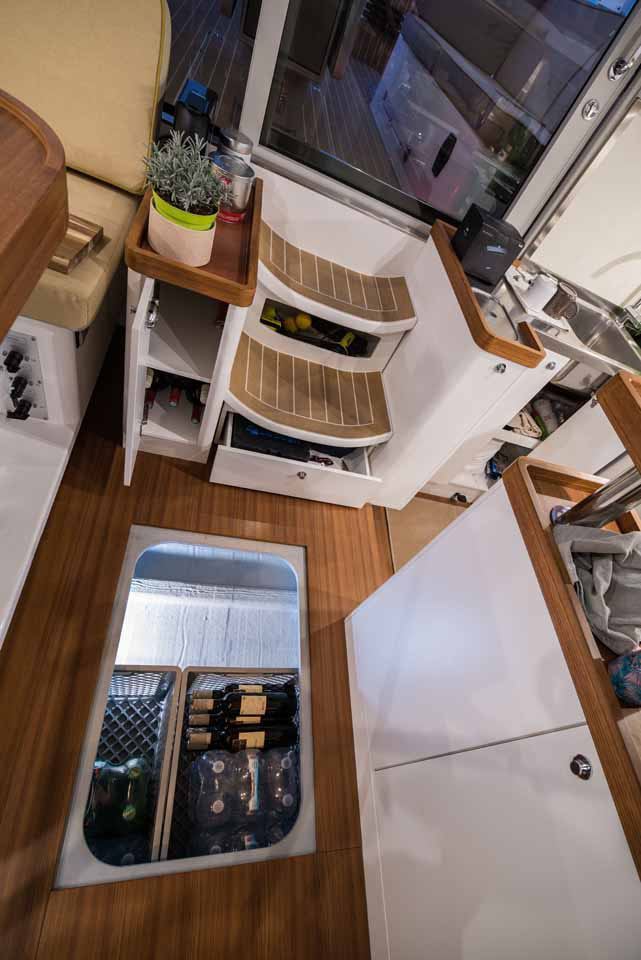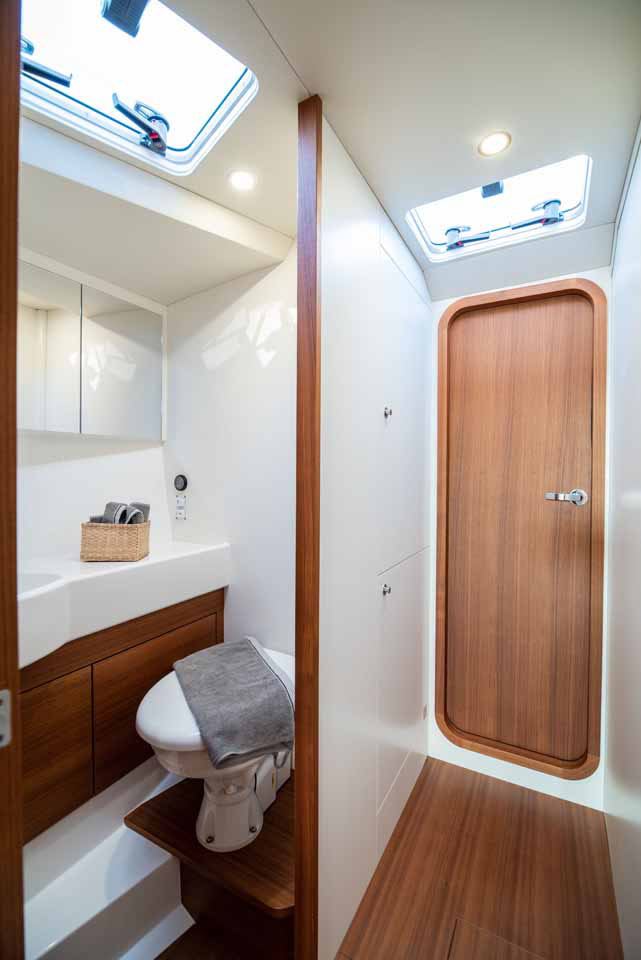 A main feature on-board the Pegasus 50 is the connection between cockpit and saloon. We wanted to make one united space. This is achieved by lowering cockpit and raising saloon floor levels. The vertical distance between two floors is three-step heights (around 60cm). Negative consequences? Sure! As cockpit moves down, it reduces standing height for aft cabins and above the saloon area arises a coach roof with 360 windows. No traditional aft cabins but one big, connected cockpit-to-saloon area, with ample of light inside and horizon visibility. Instead of traditionally dividing spaces into the interior and relatively small cockpit area, the Pegasus 50 presents a big living area (half of the yacht length), where sailors can comfort themselves during sailing and stay visually connected. The Pegasus 50 is actually split into the living area (no matter if day or night) and two cabins area forward of the saloon. Reduced cockpit-to-saloon height smoothens communication with only two steps (five to seven in traditional yachts).