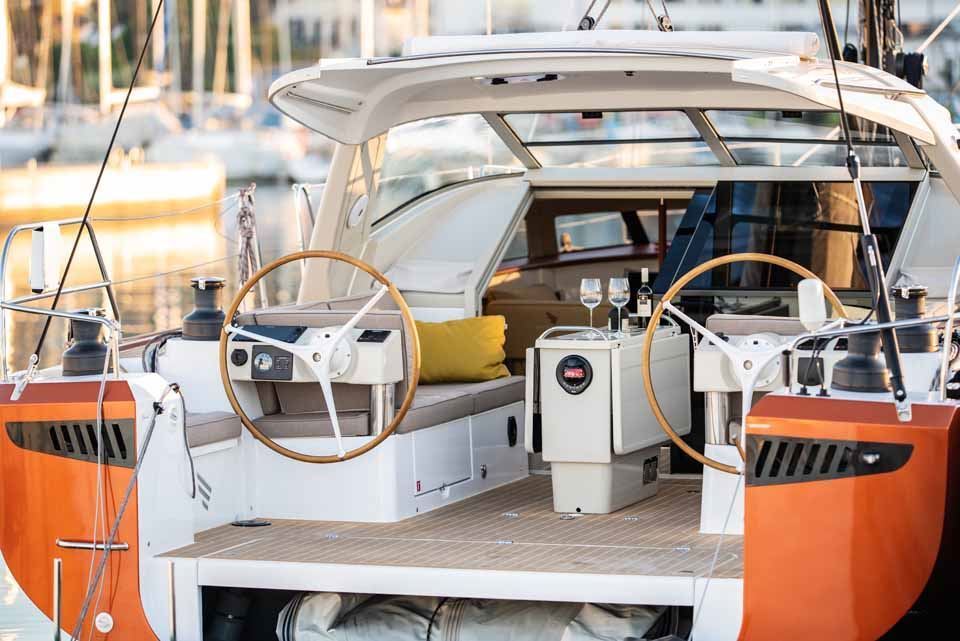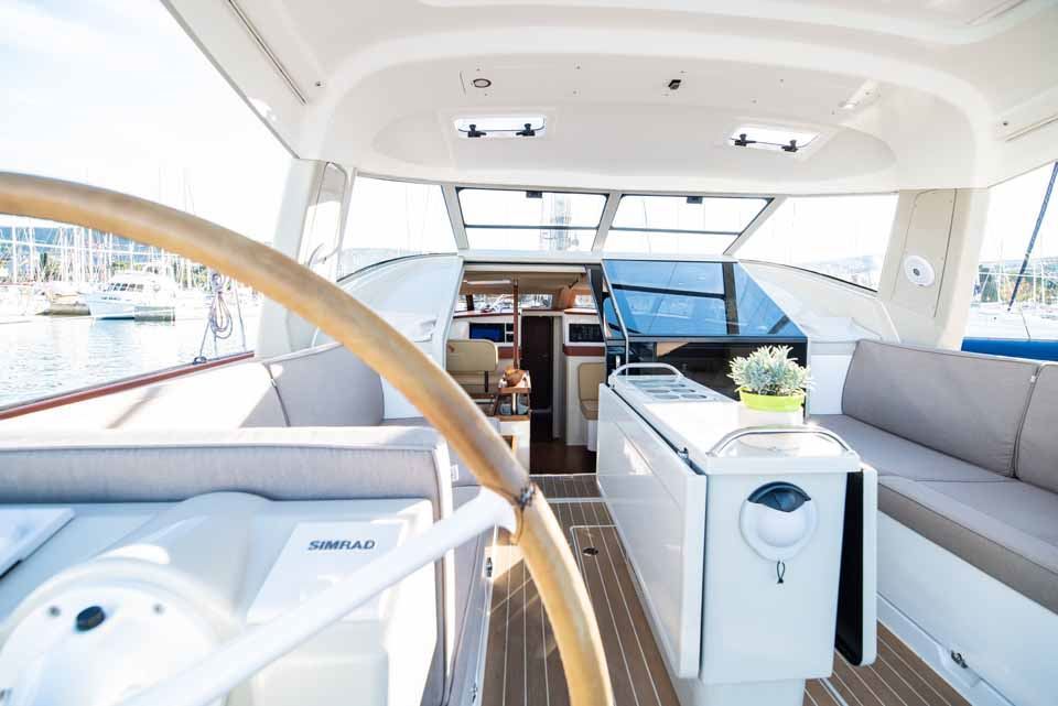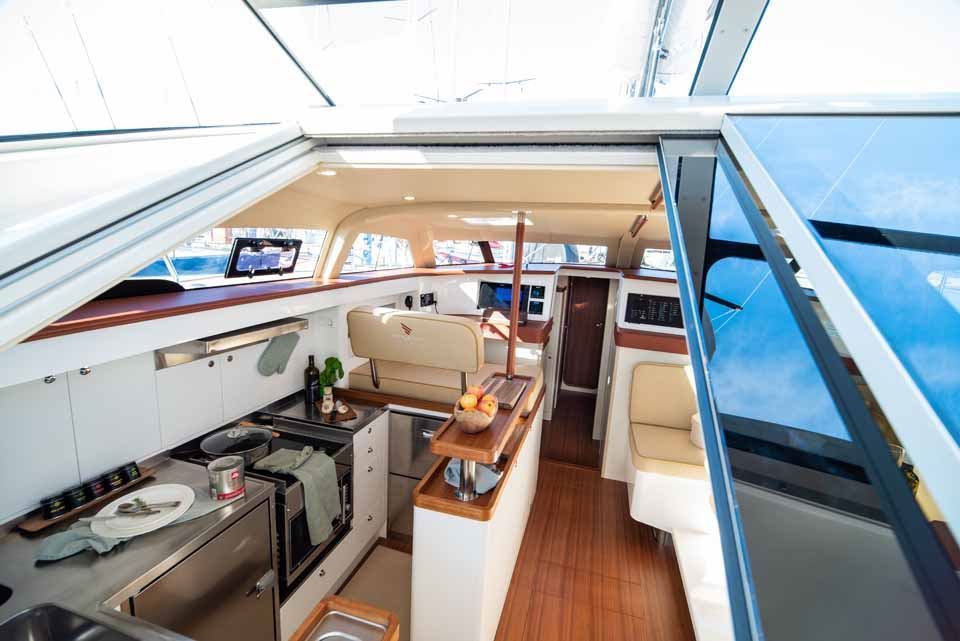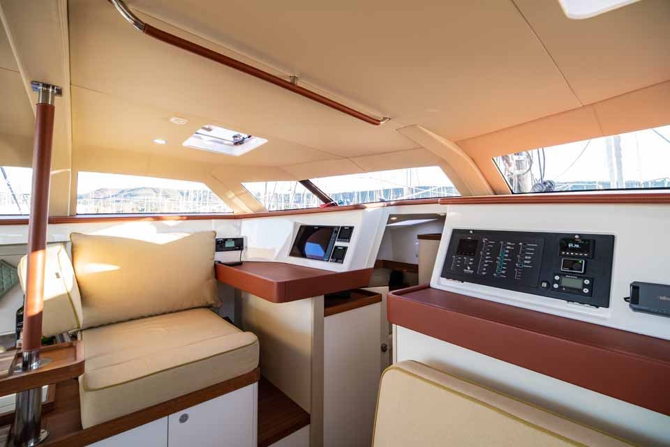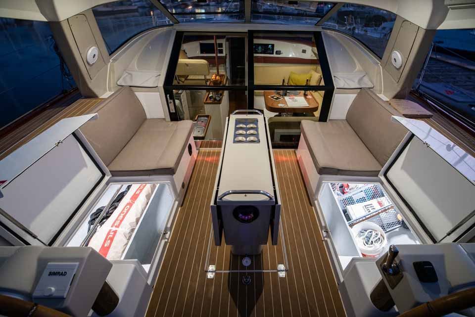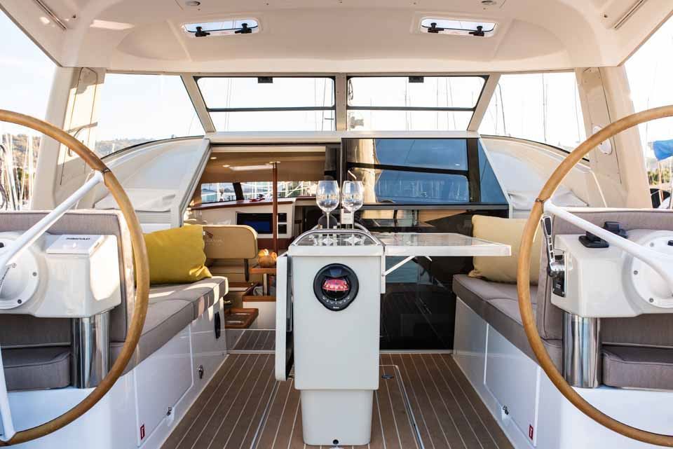 Sailing around the world in the equatorial belt and Mediterranean requires good sun UV protection. Some areas require protection from rain and spray. For this reason, yachters are using all kind of dodgers, bimini covers and removable tents. So, why not integrate all these add-ons into an elegant streamlined rigid cockpit roof? A lightweight carbon roof connected to the mainsheet arch with a possibility to place solar panels on. A protective glass windshield and cockpit rooftop that opens like a soft cabriolet car roof when desired, but all remains in place and no additional storage needed. And it is really chic.