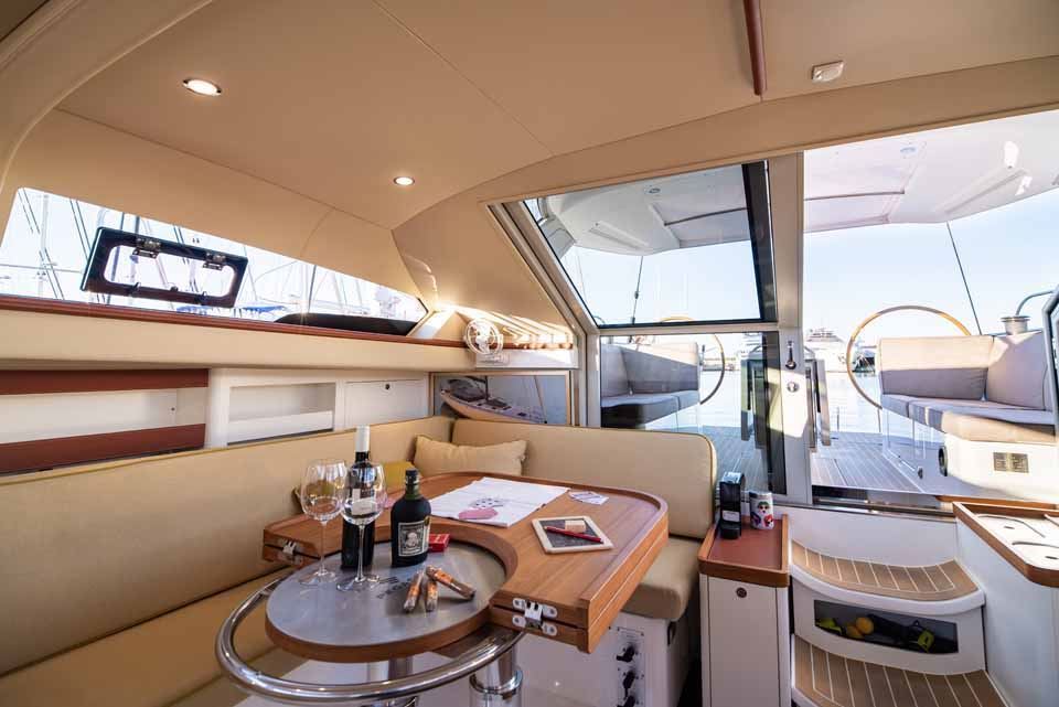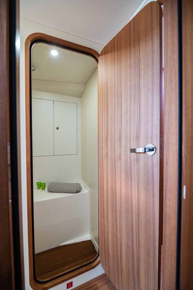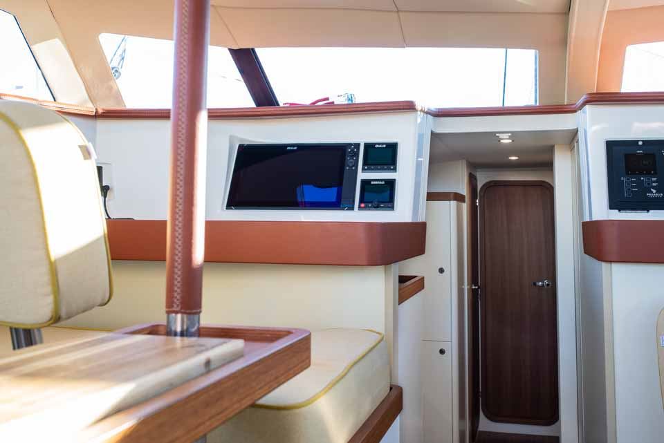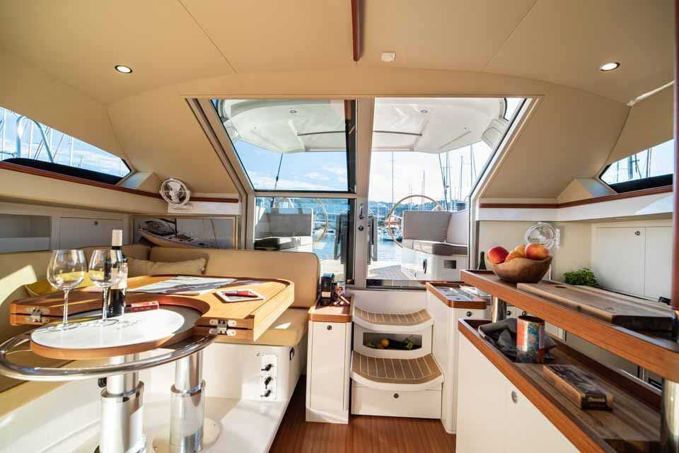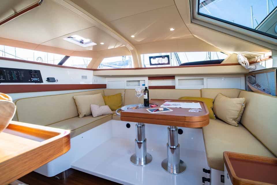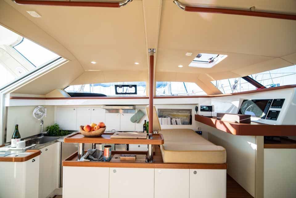Sailing around the world in the equatorial belt and Mediterranean requires good sun UV protection. Some areas require protection from rain and spray. For this reason, yachters are using all kind of dodgers, bimini covers and removable tents. So, why not integrate all these add-ons into an elegant streamlined rigid cockpit roof? A lightweight carbon roof connected to the mainsheet arch with a possibility to place solar panels on. A protective glass windshield and cockpit rooftop that opens like a soft cabriolet car roof when desired, but all remains in place and no additional storage needed. And it is really chic.