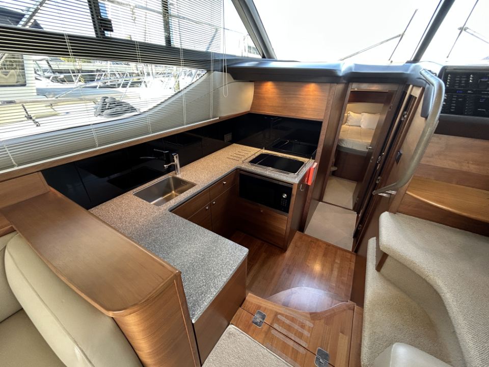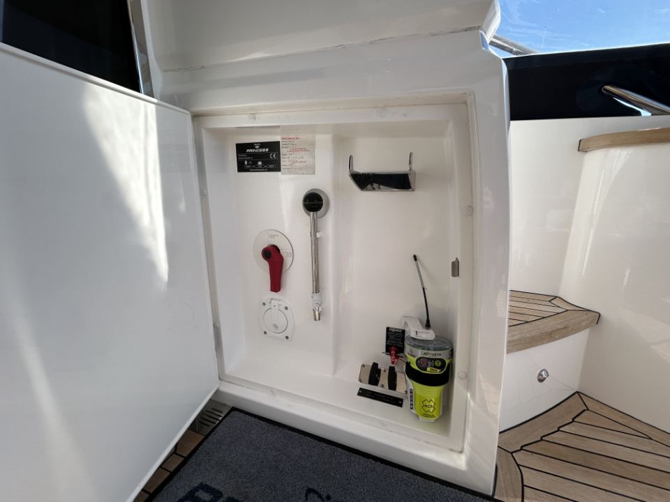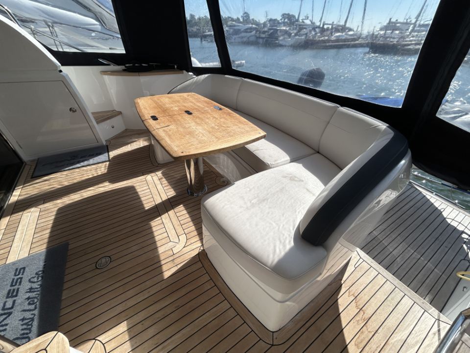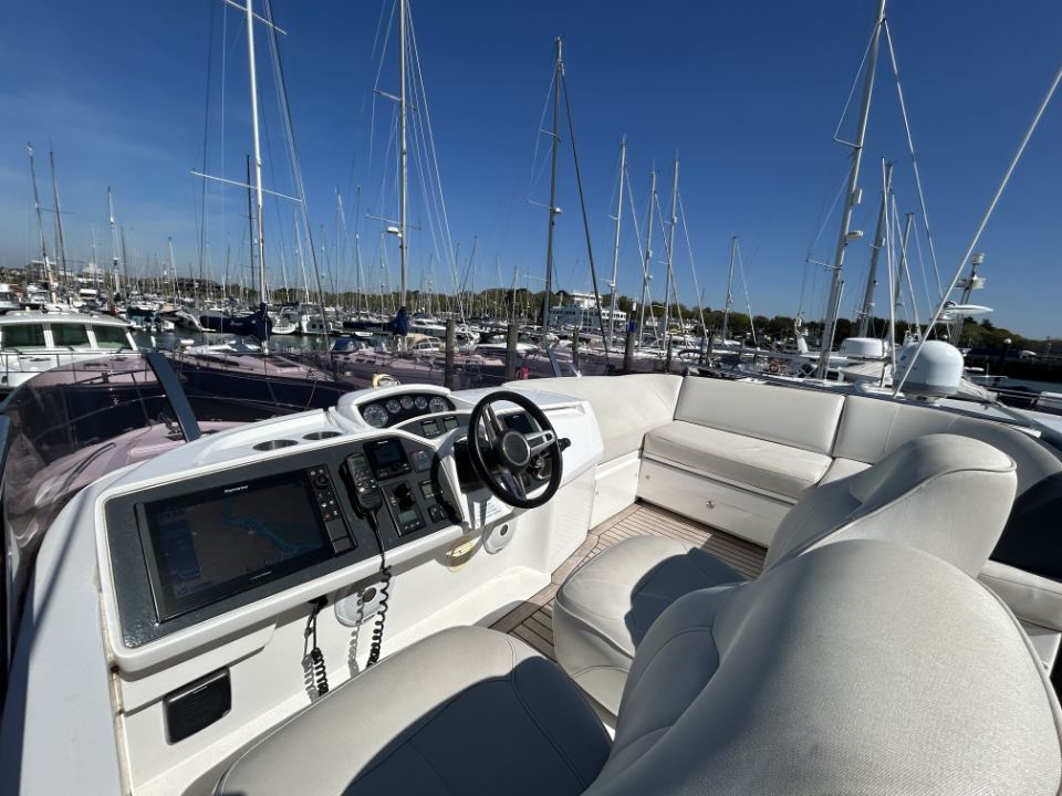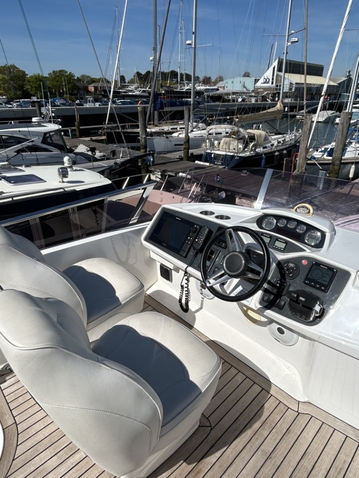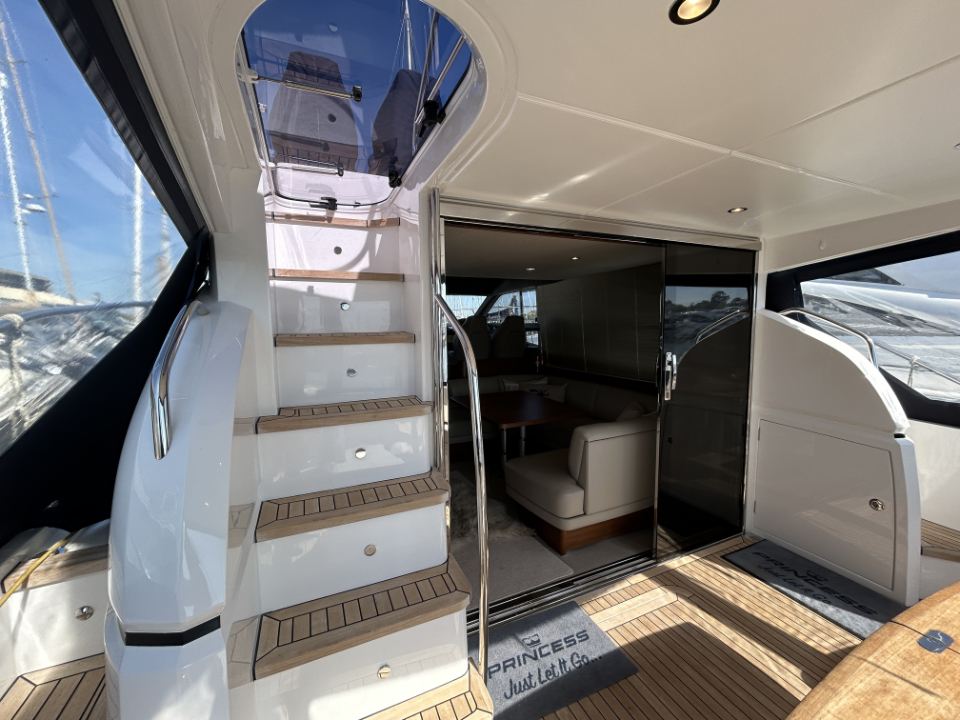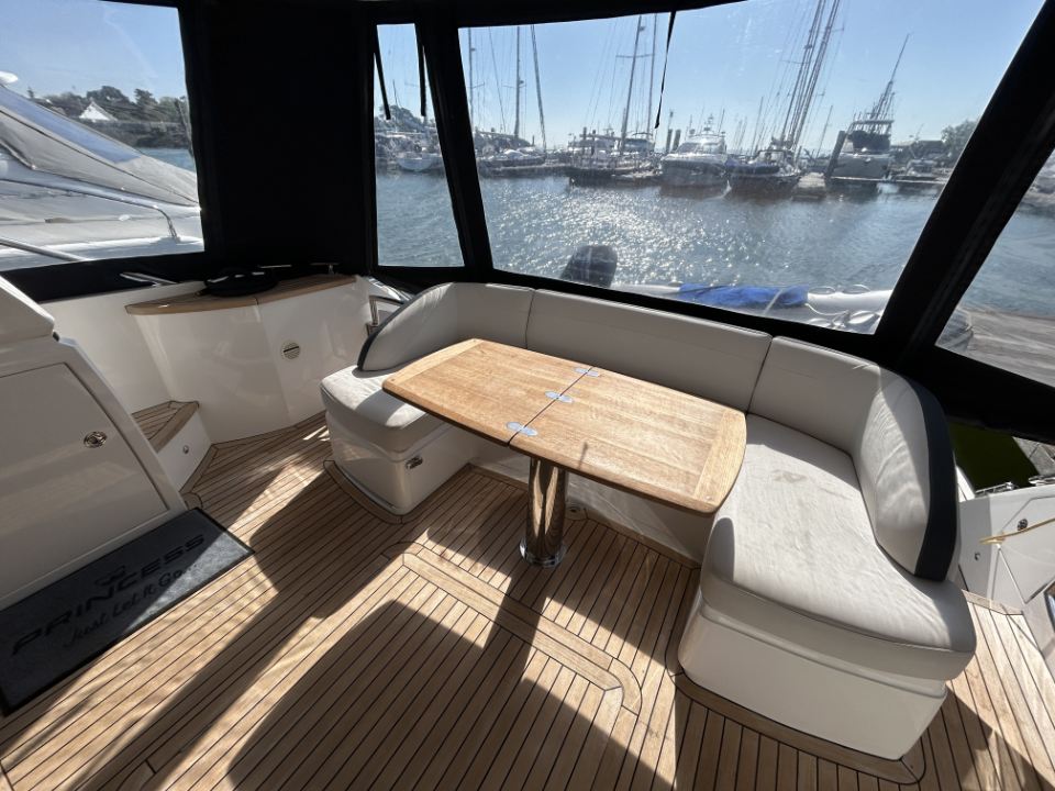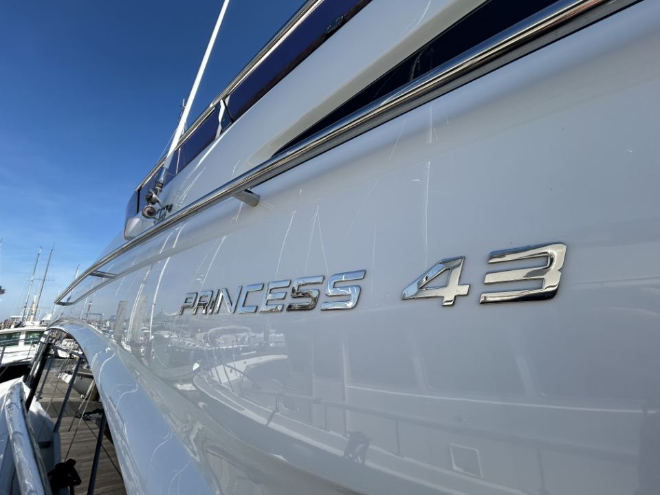 This 2016 Princess 43 is in lovely condition, with a sensible amount of use, highly practical UK cruising specification, and dependable, reliable shaft drive propulsion. Stepping on board into the sheltered aft cockpit, this feels like a much larger yacht – with access from both sides of the bathing platform, side deck steps, a large central seating area, and a large deck hatch for engine inspection forward and lazarette entry aft. Teak-treaded stairs lead up to her flybridge deck, which is also laid in teak, and offers two large seating areas, the optional wet bar, large aft table, and twin helm seats at the forward console.