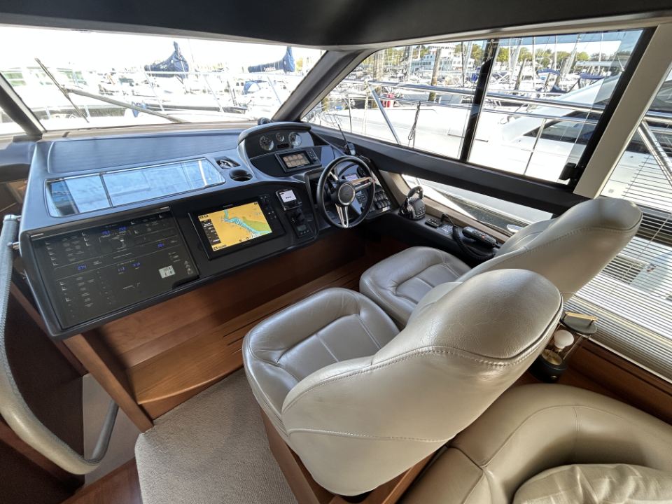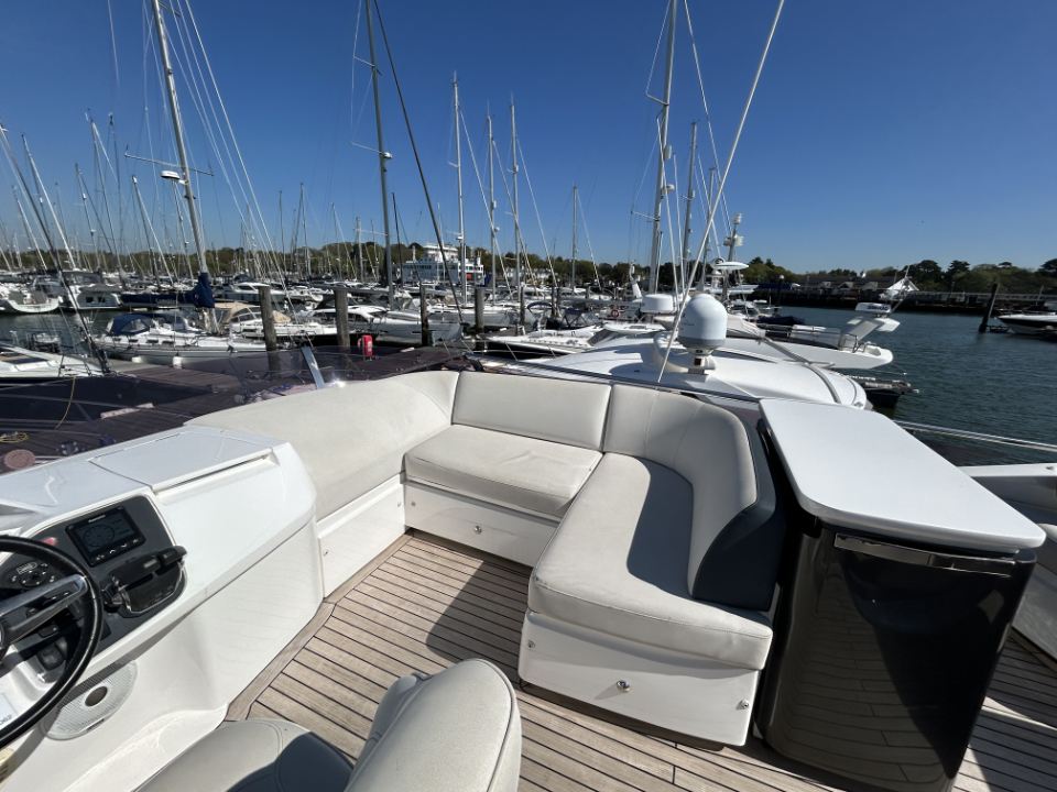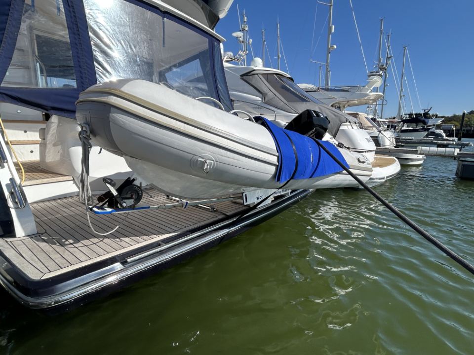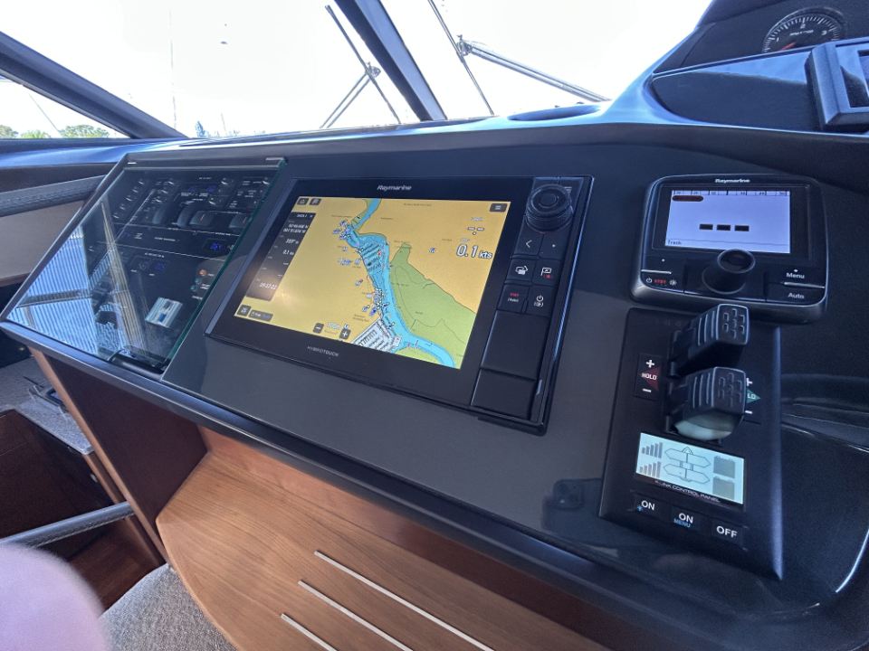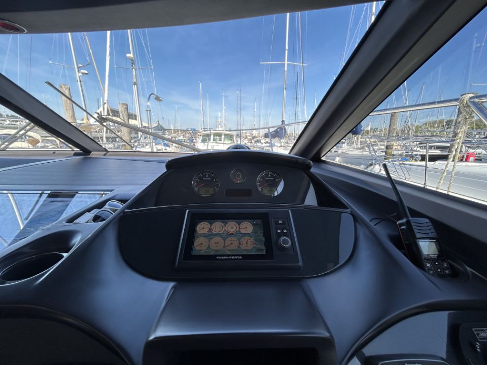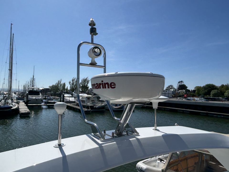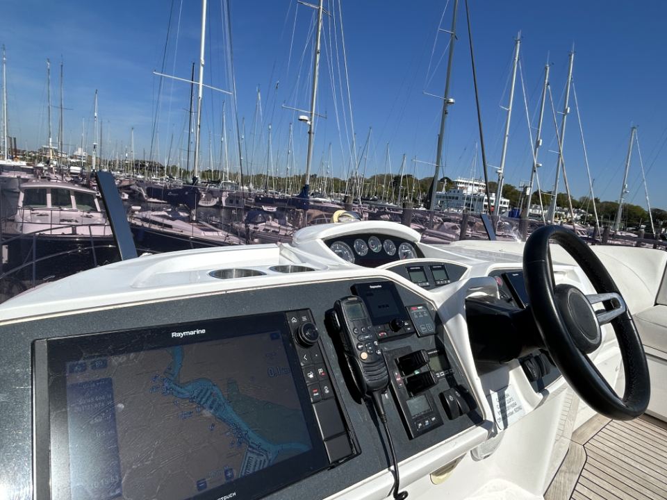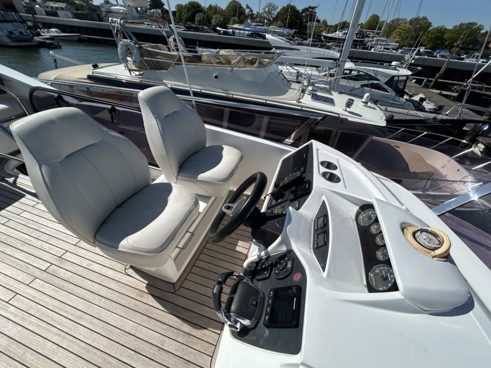 On the water she is no slouch either, with stiff, light, resin-infused construction giving her Olesinski-designed hull a taut, well-balanced feel, with precise steering and easy handling in marina thanks to her twin variable thrusters. Her flybridge helm is near-central – ensuring great all-round visibility under way and unobstructed sightlines when docking. We note that she had a docking camera added by her current owners, and an aluminium RIB is located on her easy-action Hurley davit system.