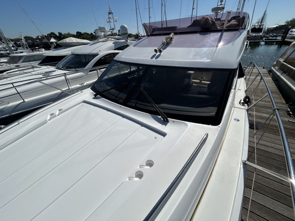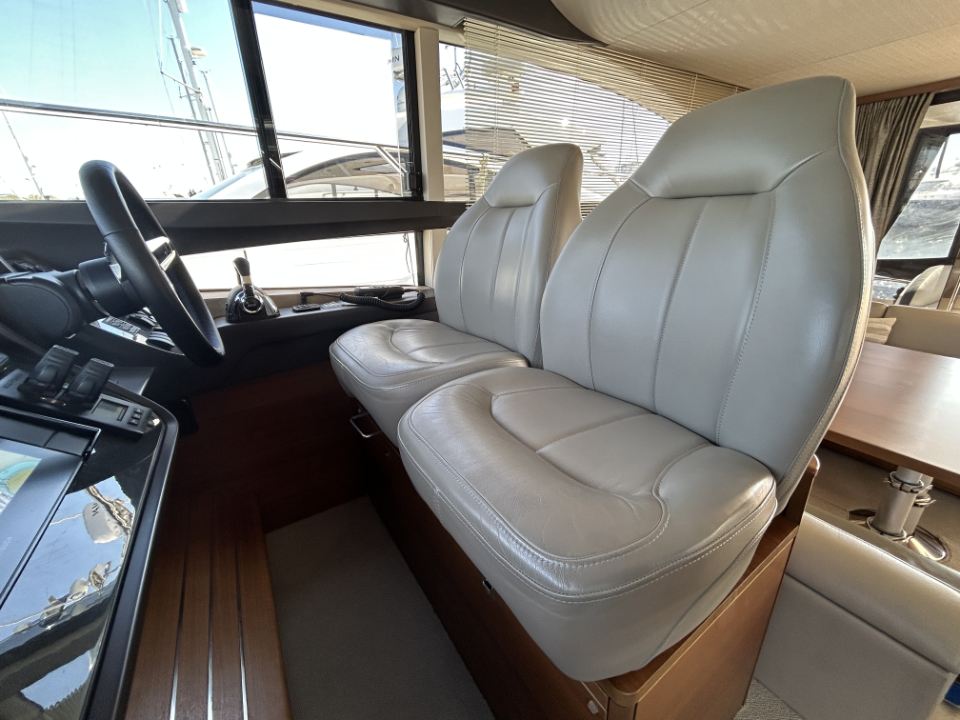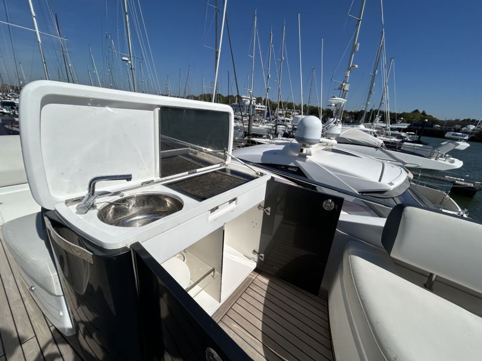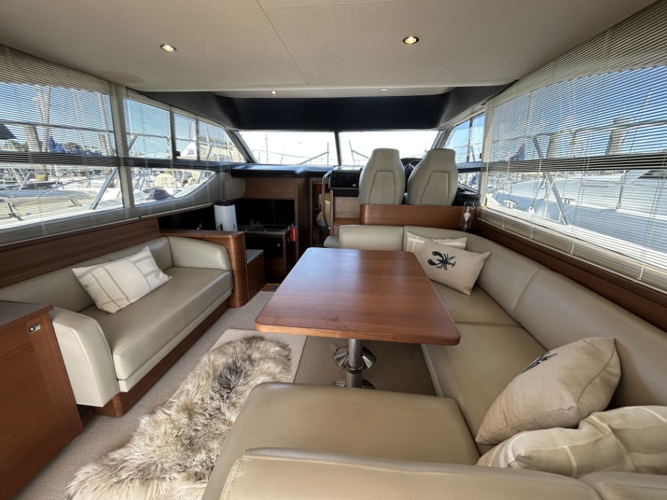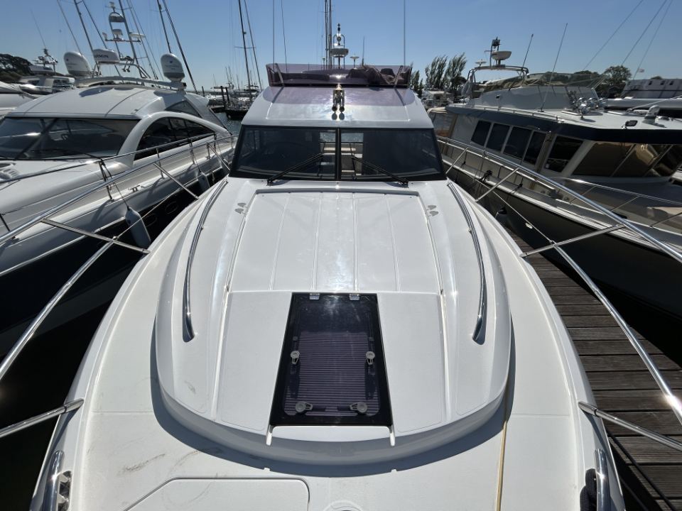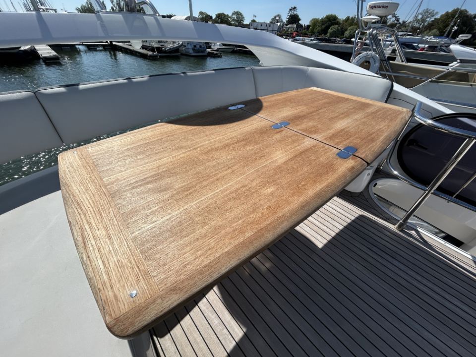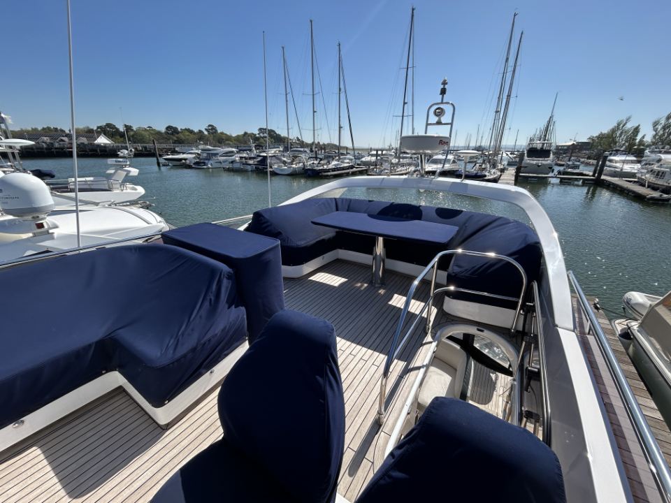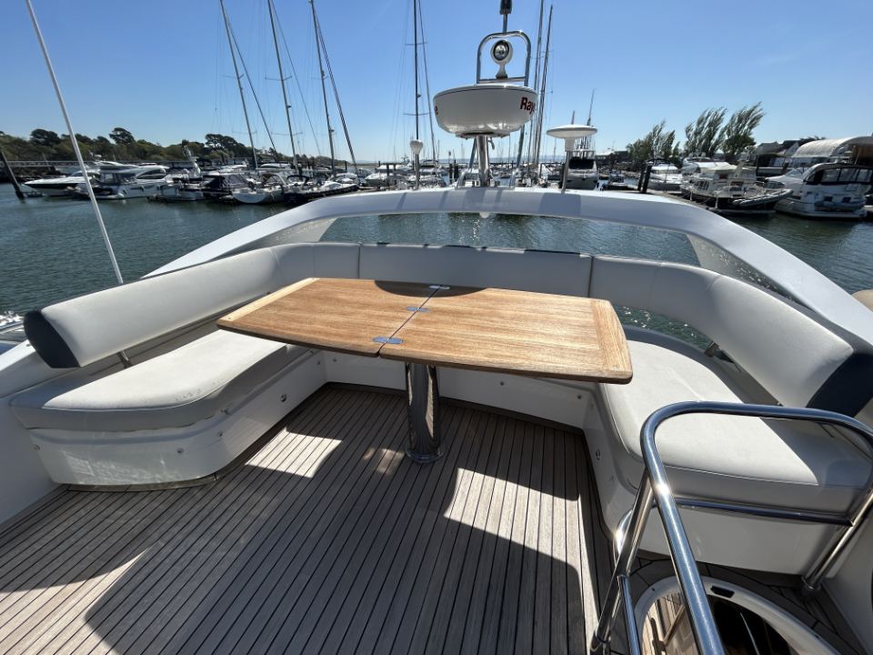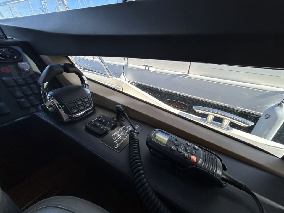 On the water she is no slouch either, with stiff, light, resin-infused construction giving her Olesinski-designed hull a taut, well-balanced feel, with precise steering and easy handling in marina thanks to her twin variable thrusters. Her flybridge helm is near-central – ensuring great all-round visibility under way and unobstructed sightlines when docking. We note that she had a docking camera added by her current owners, and an aluminium RIB is located on her easy-action Hurley davit system.