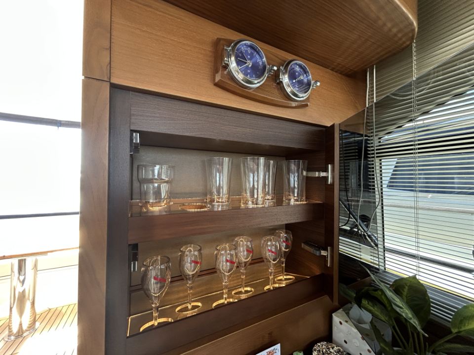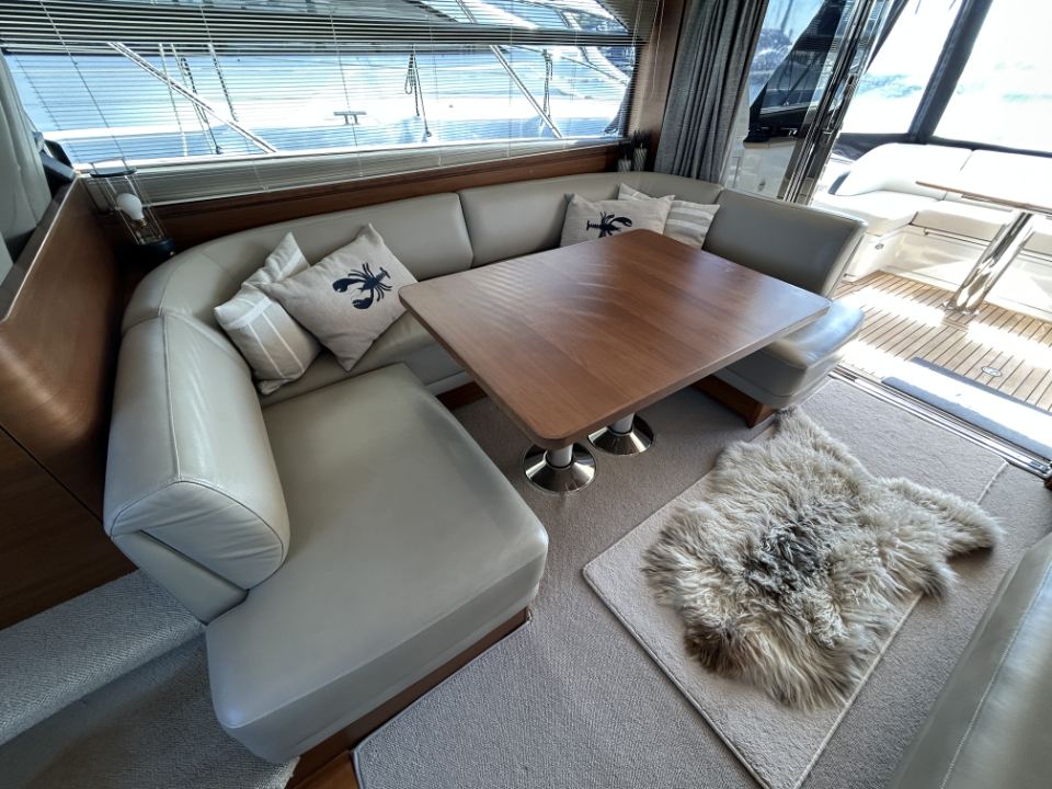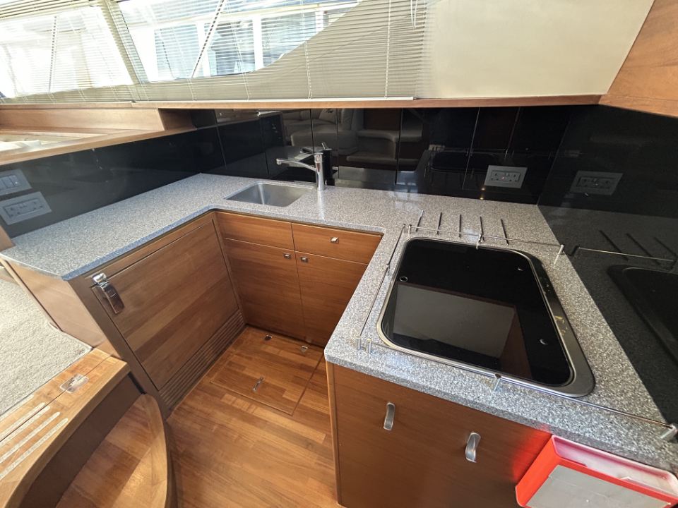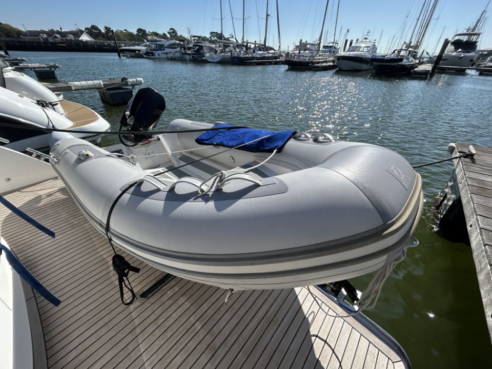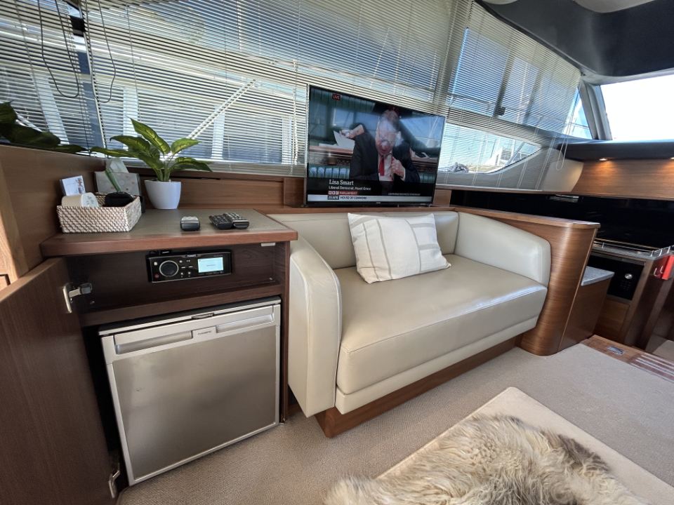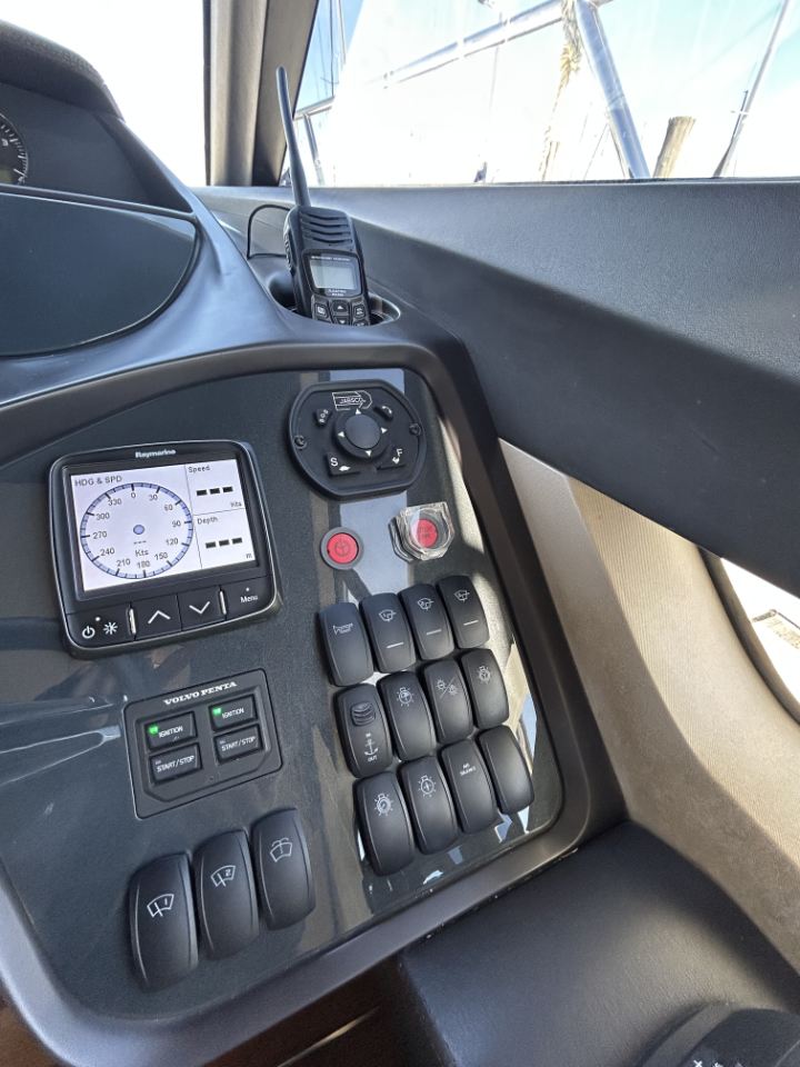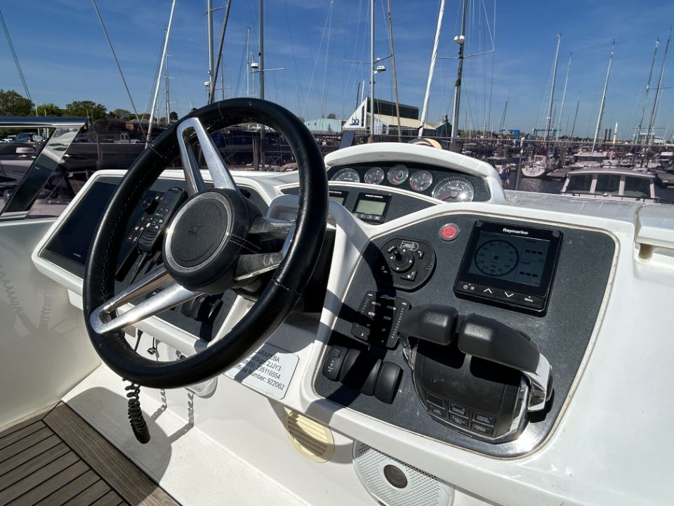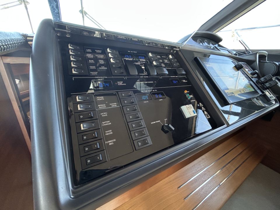 On the water she is no slouch either, with stiff, light, resin-infused construction giving her Olesinski-designed hull a taut, well-balanced feel, with precise steering and easy handling in marina thanks to her twin variable thrusters. Her flybridge helm is near-central – ensuring great all-round visibility under way and unobstructed sightlines when docking. We note that she had a docking camera added by her current owners, and an aluminium RIB is located on her easy-action Hurley davit system.