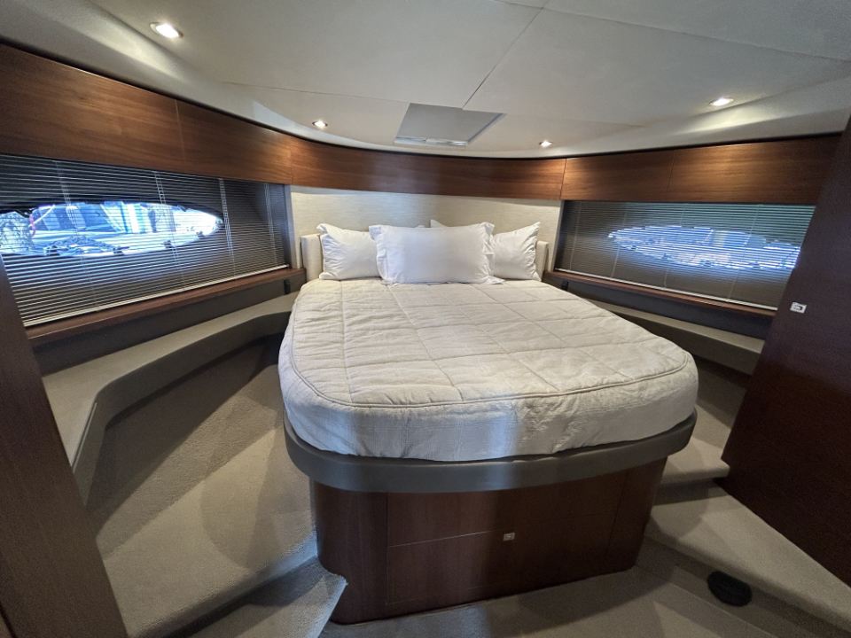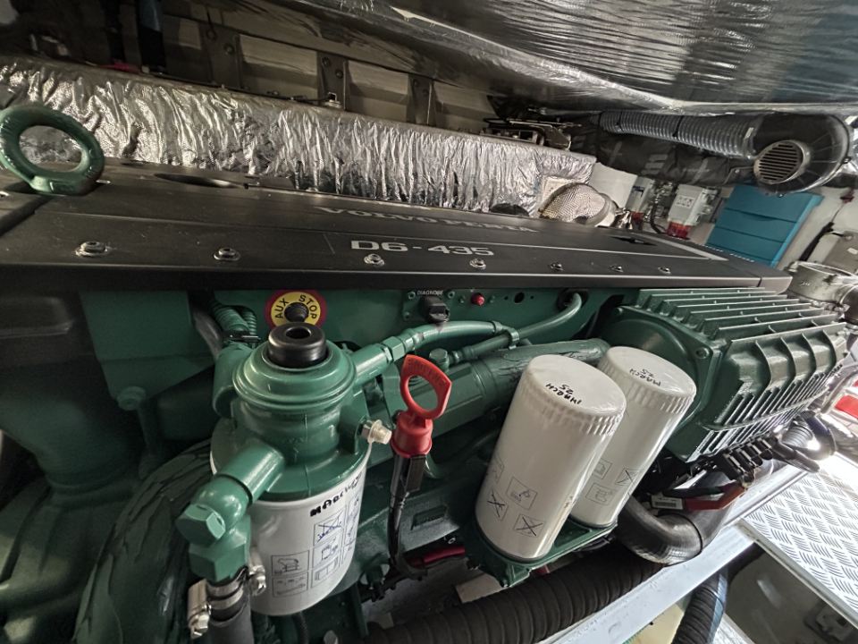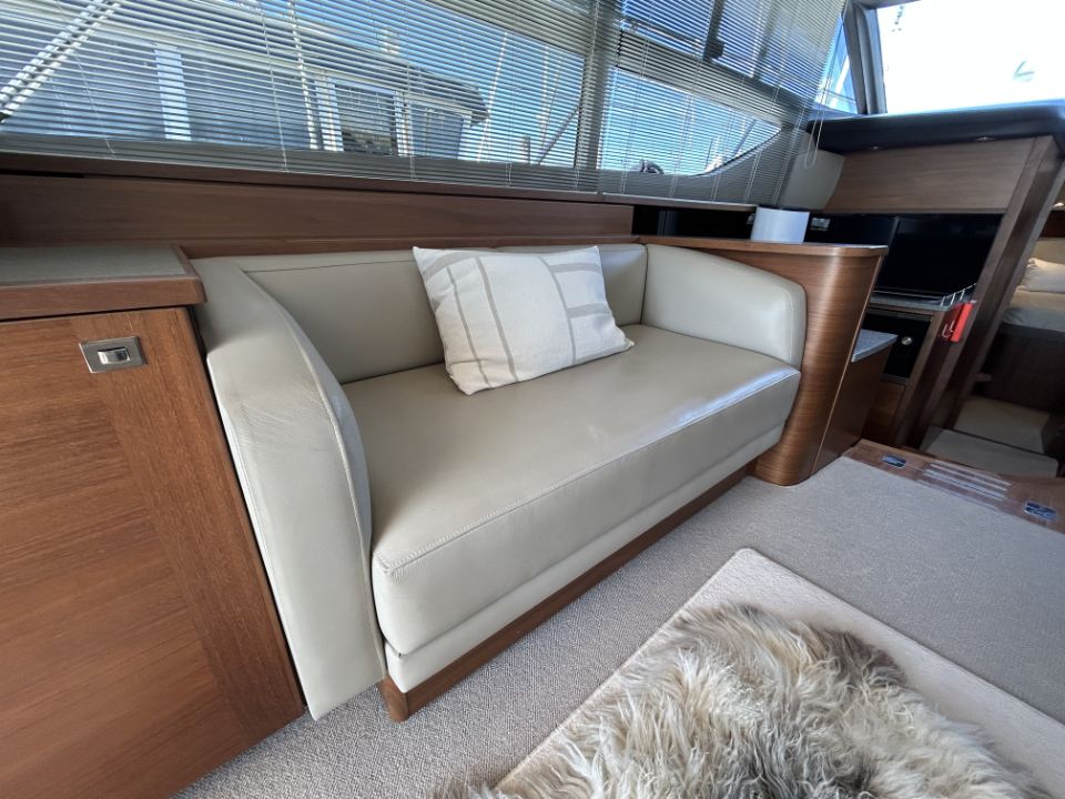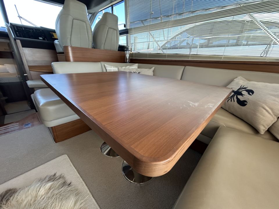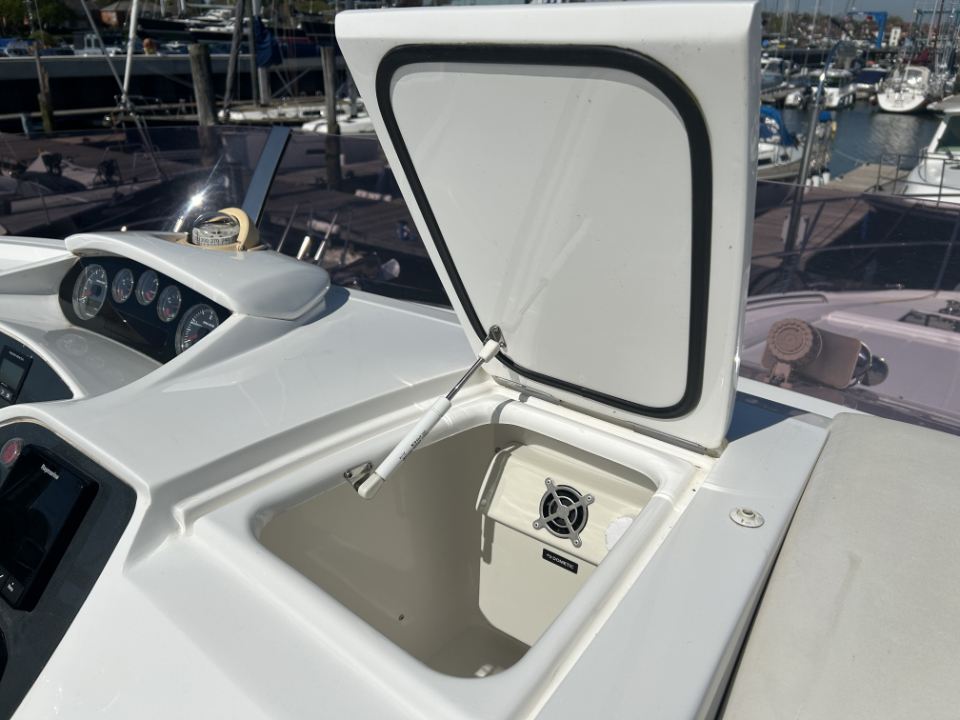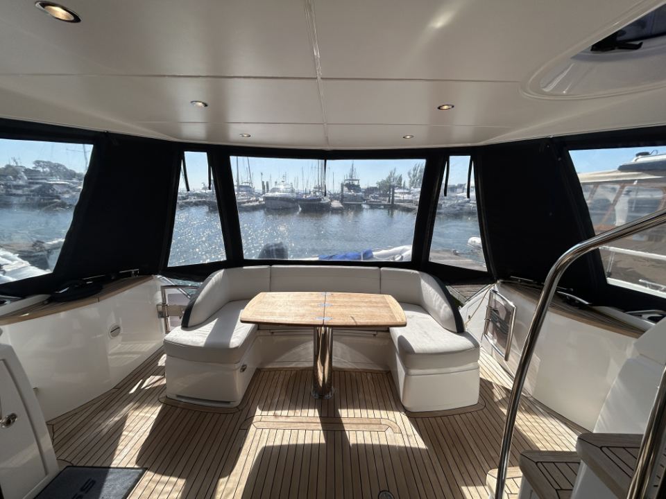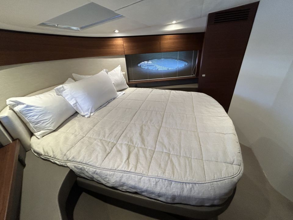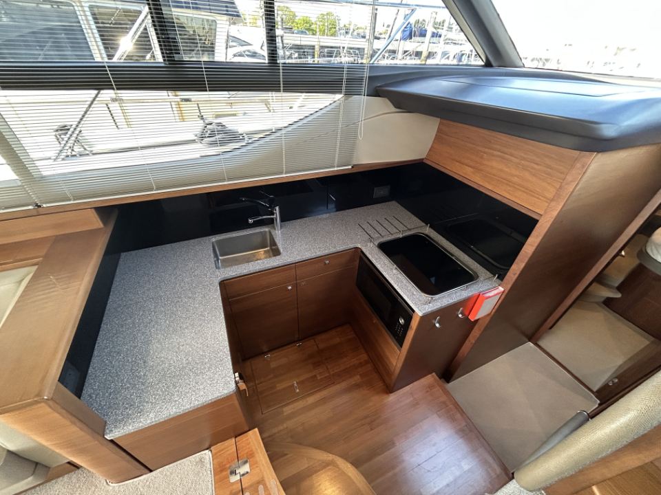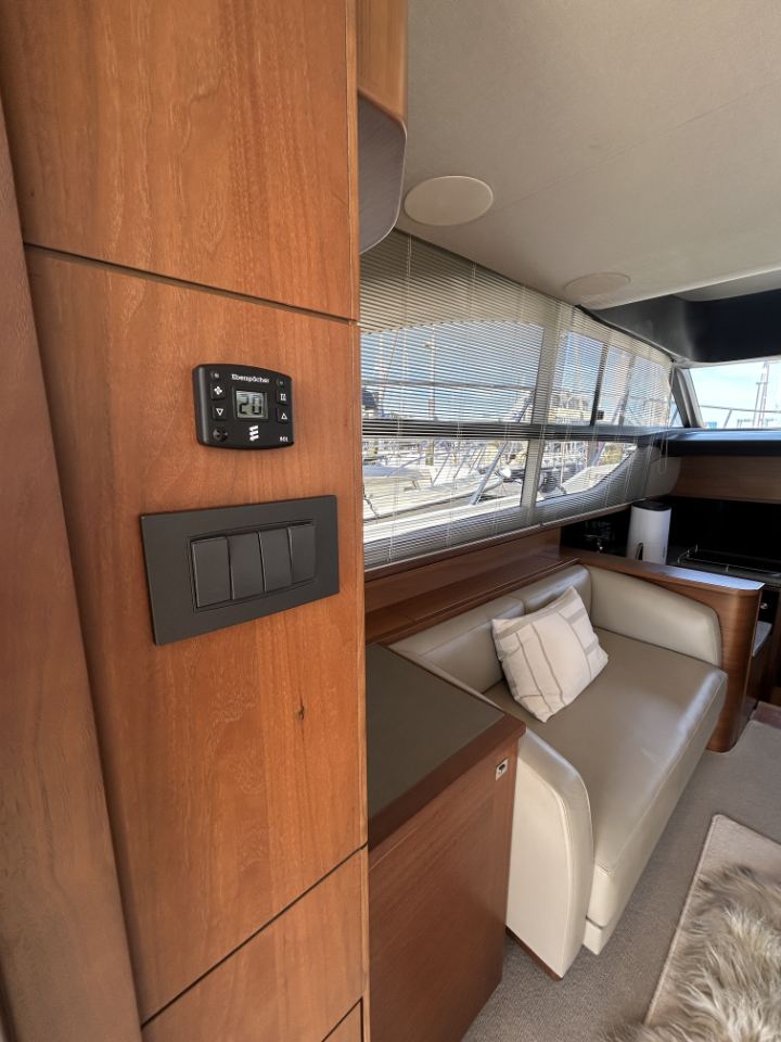 On the water she is no slouch either, with stiff, light, resin-infused construction giving her Olesinski-designed hull a taut, well-balanced feel, with precise steering and easy handling in marina thanks to her twin variable thrusters. Her flybridge helm is near-central – ensuring great all-round visibility under way and unobstructed sightlines when docking. We note that she had a docking camera added by her current owners, and an aluminium RIB is located on her easy-action Hurley davit system.