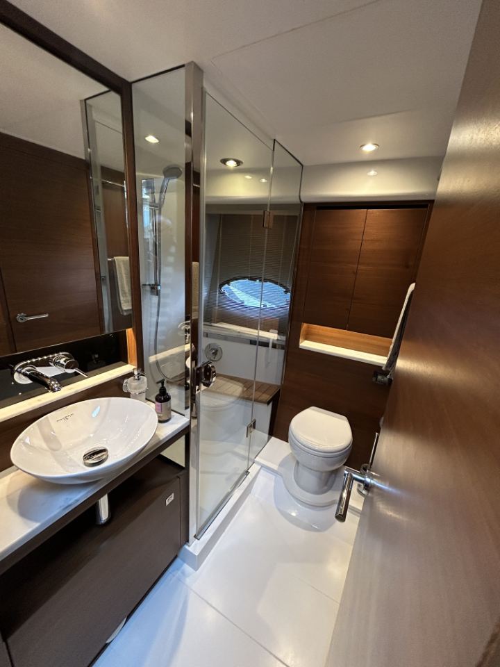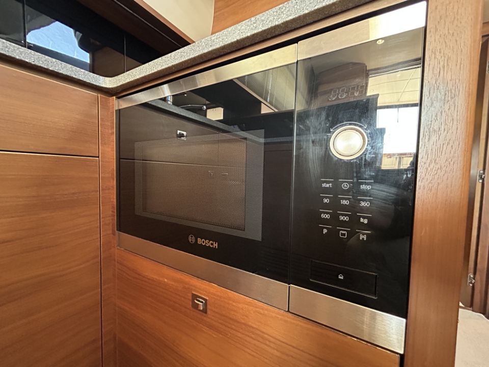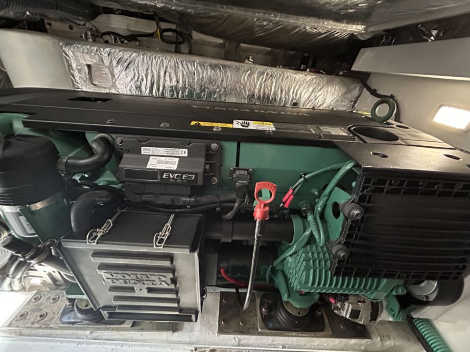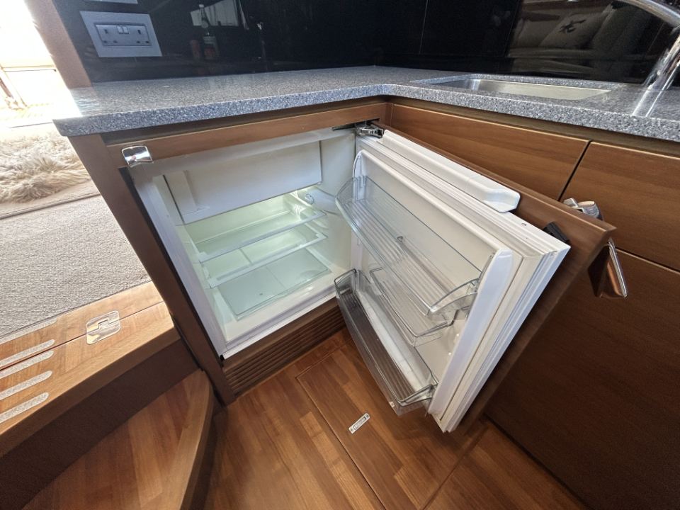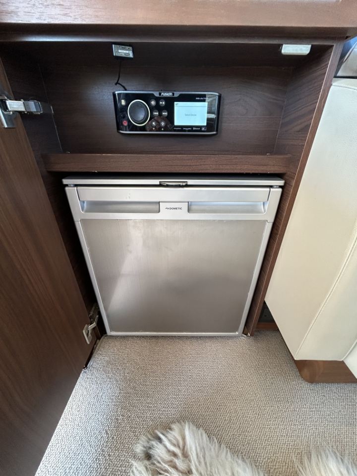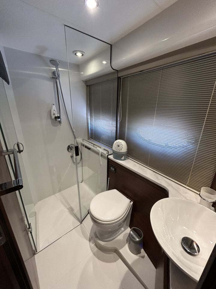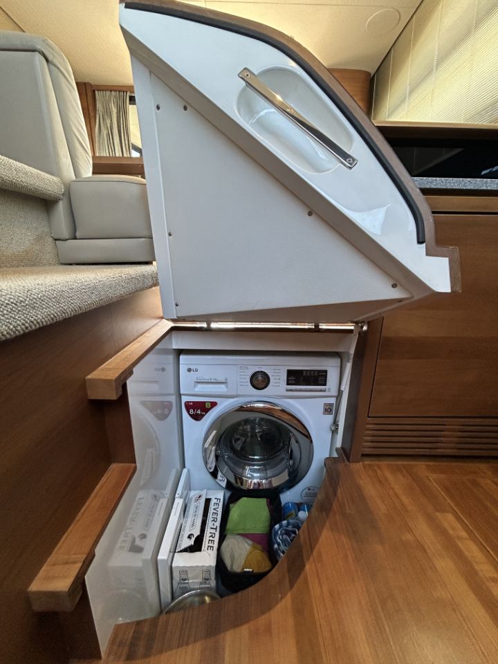 Her interior is trimmed in the satin gloss American Walnut upgrade option, with contrasting carpets lending a calm, sophisticated feel throughout. There is a huge amount of light coming in through the slim-mullioned, wrap-around windows in her superstructure and main saloon exploits its space with a large U-shaped sofa to starboard and a two-seater sofa facing it to port. The large table will allow plenty of guests to eat, whilst a hi-lo pops up to transform the area into a cosy lounge. Heading forward and down a pair of steps is a fully fitted galley, conveniently dropped down a level to the port side, with a large worktop area, gas hob, sink, fridge, and oven. There is plenty of light again here, and a washer-dryer is neatly tucked away beneath the saloon stairs in a super-practical touch. The main forward Master has a raised island double berth, vanity area to port and a tall hanging locker to starboard – with large elliptical opening port-lights and an overhead opening hatch, and the cabin is en-suite to its own heads/shower set to port. Swathes of varnished walnut timber and tactile fabric liners add class and style to this cabin, and she has been obviously cherished. The day head is located to starboard, and has a door from the main lobby, and a private door to the guest twin cabin. With a large walk-in shower, this is a very good-sized facility, and is presented in pristine order. The twin cabin has a large hanging locker, again two opening port-lights, and is trimmed to the same exacting standard as the rest of the accommodation. Thus, she provides a super-versatile layout that would equally suit both the cruising family or a couple looking to enjoy the space she affords.