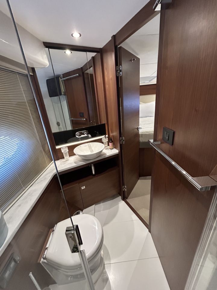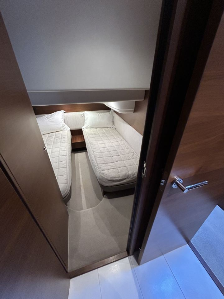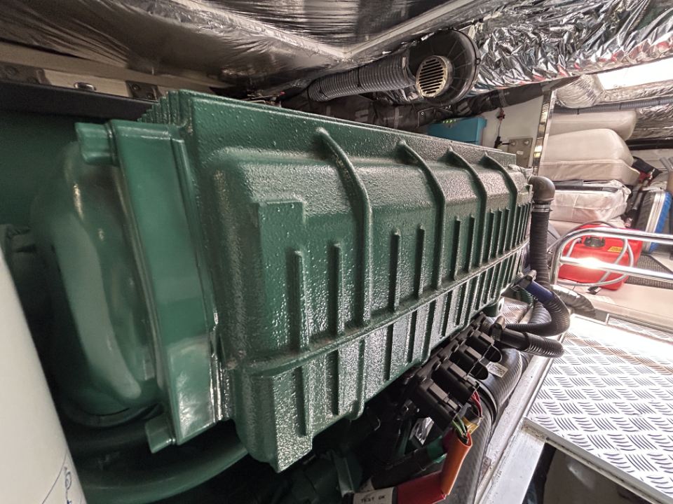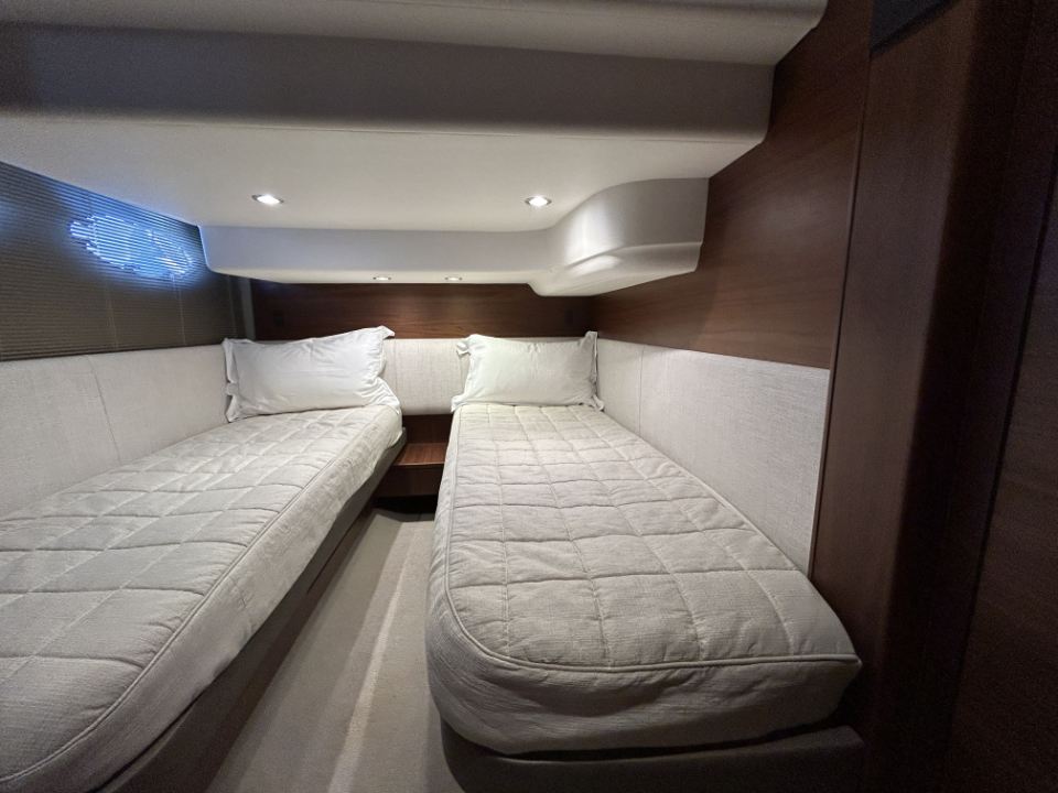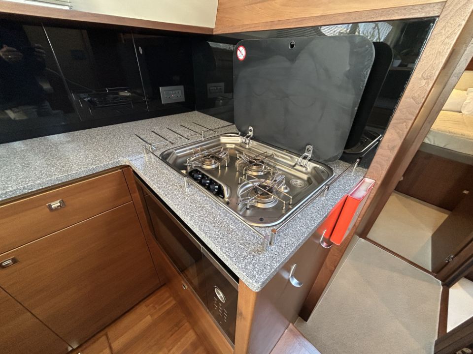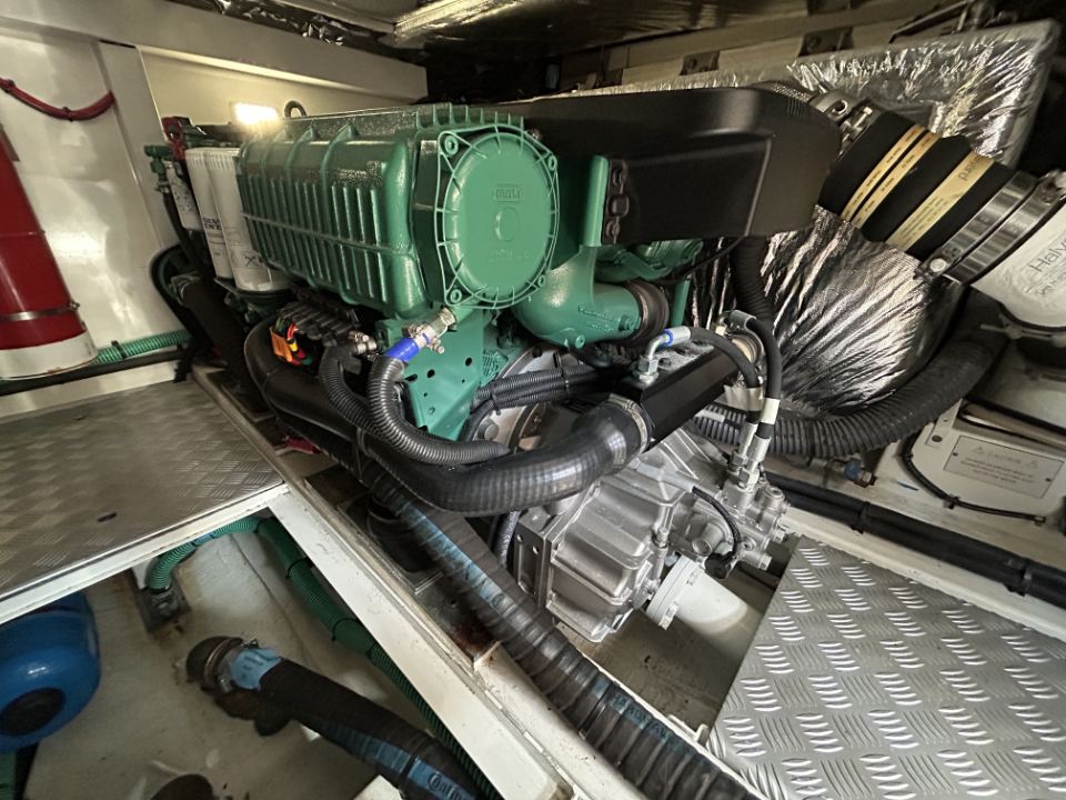 Her interior is trimmed in the satin gloss American Walnut upgrade option, with contrasting carpets lending a calm, sophisticated feel throughout. There is a huge amount of light coming in through the slim-mullioned, wrap-around windows in her superstructure and main saloon exploits its space with a large U-shaped sofa to starboard and a two-seater sofa facing it to port. The large table will allow plenty of guests to eat, whilst a hi-lo pops up to transform the area into a cosy lounge. Heading forward and down a pair of steps is a fully fitted galley, conveniently dropped down a level to the port side, with a large worktop area, gas hob, sink, fridge, and oven. There is plenty of light again here, and a washer-dryer is neatly tucked away beneath the saloon stairs in a super-practical touch. The main forward Master has a raised island double berth, vanity area to port and a tall hanging locker to starboard – with large elliptical opening port-lights and an overhead opening hatch, and the cabin is en-suite to its own heads/shower set to port. Swathes of varnished walnut timber and tactile fabric liners add class and style to this cabin, and she has been obviously cherished. The day head is located to starboard, and has a door from the main lobby, and a private door to the guest twin cabin. With a large walk-in shower, this is a very good-sized facility, and is presented in pristine order. The twin cabin has a large hanging locker, again two opening port-lights, and is trimmed to the same exacting standard as the rest of the accommodation. Thus, she provides a super-versatile layout that would equally suit both the cruising family or a couple looking to enjoy the space she affords.