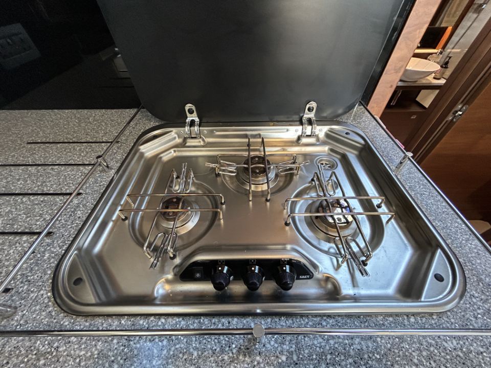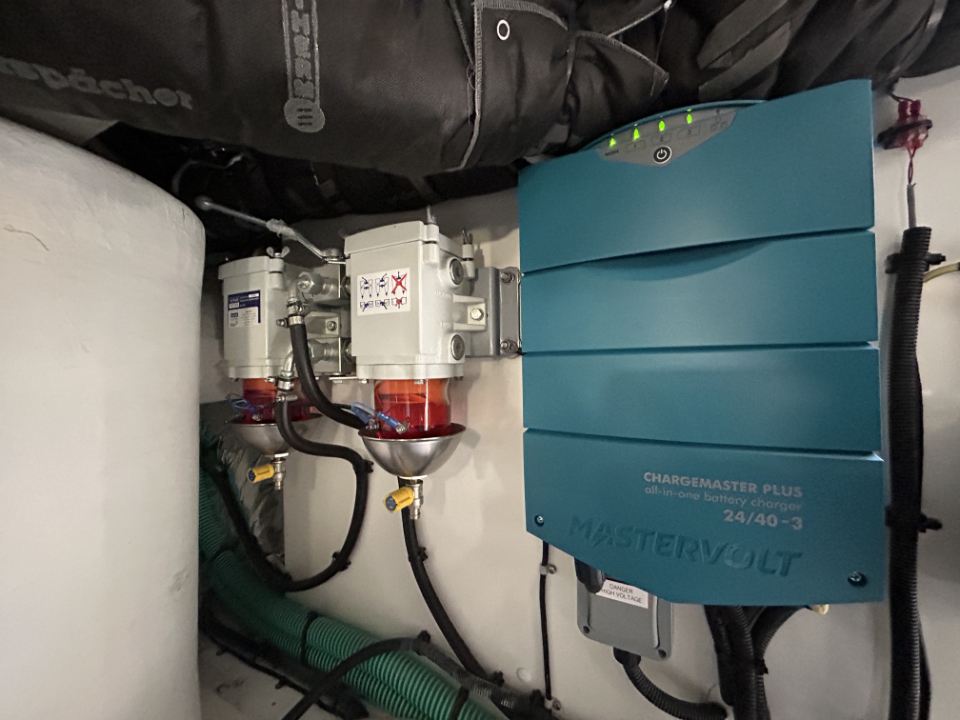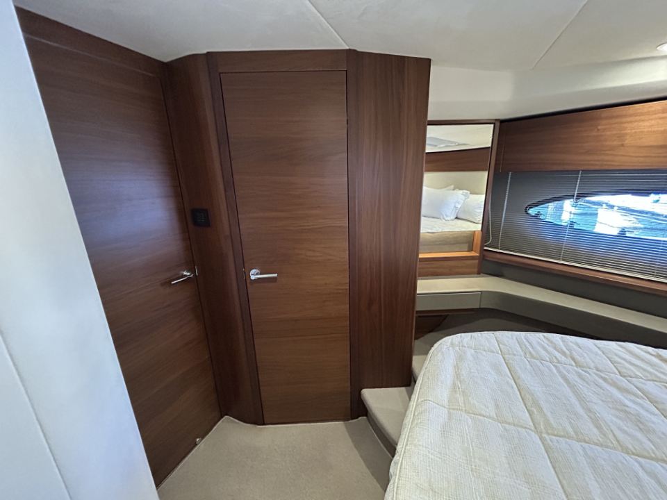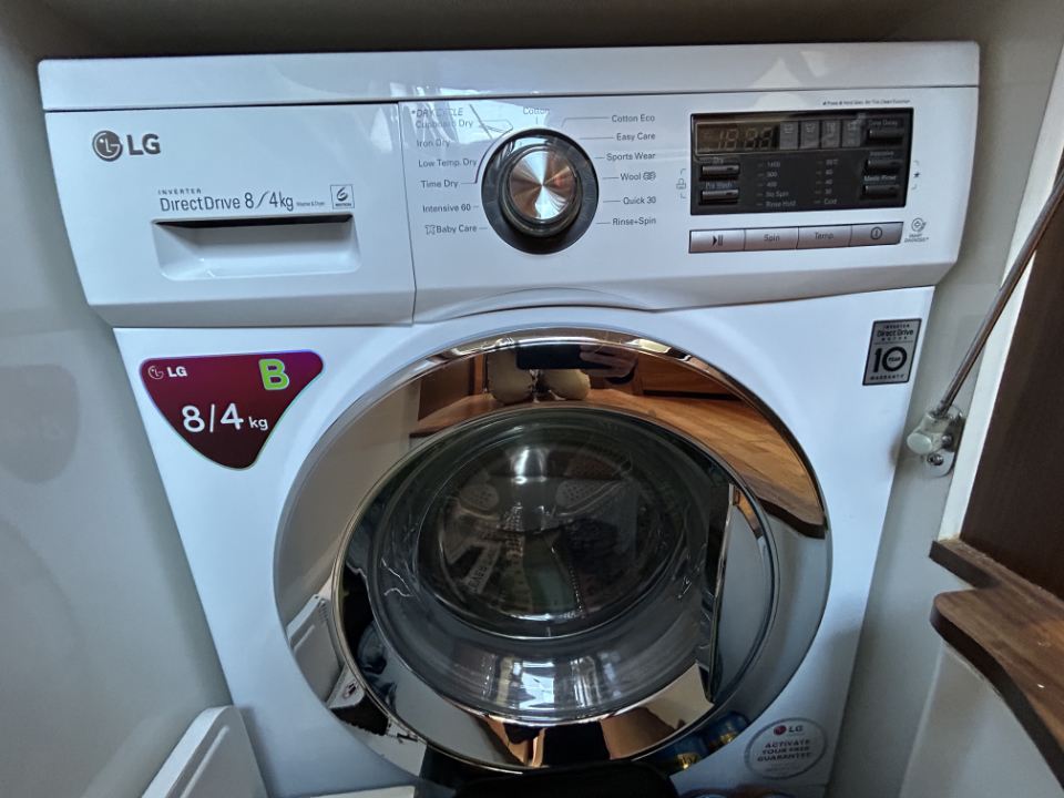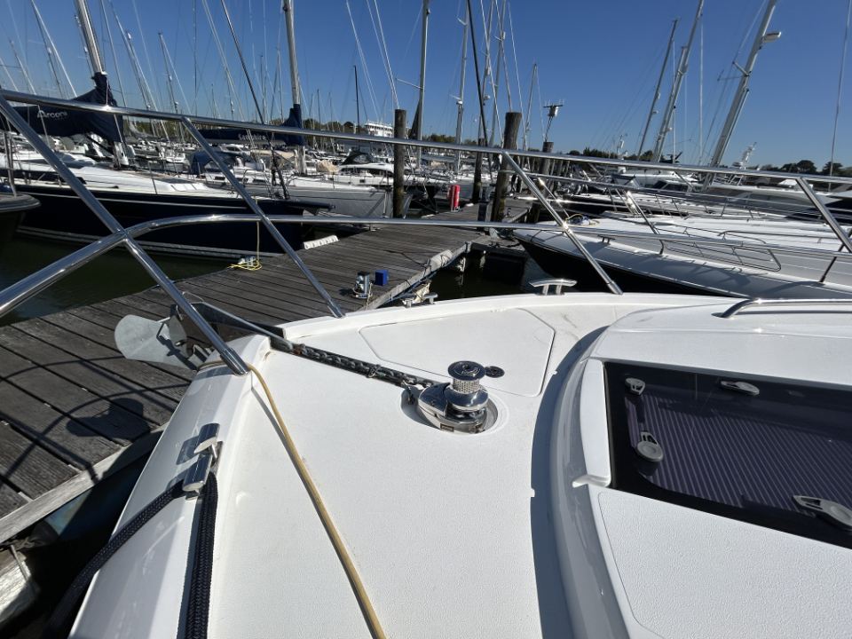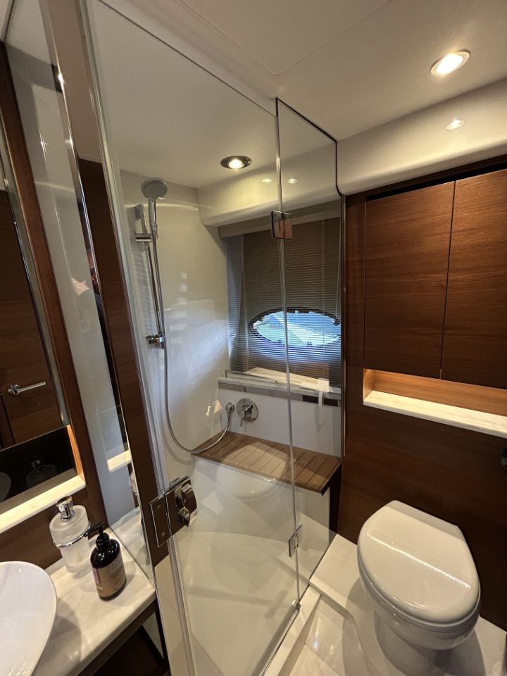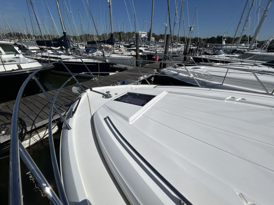 Her interior is trimmed in the satin gloss American Walnut upgrade option, with contrasting carpets lending a calm, sophisticated feel throughout. There is a huge amount of light coming in through the slim-mullioned, wrap-around windows in her superstructure and main saloon exploits its space with a large U-shaped sofa to starboard and a two-seater sofa facing it to port. The large table will allow plenty of guests to eat, whilst a hi-lo pops up to transform the area into a cosy lounge. Heading forward and down a pair of steps is a fully fitted galley, conveniently dropped down a level to the port side, with a large worktop area, gas hob, sink, fridge, and oven. There is plenty of light again here, and a washer-dryer is neatly tucked away beneath the saloon stairs in a super-practical touch. The main forward Master has a raised island double berth, vanity area to port and a tall hanging locker to starboard – with large elliptical opening port-lights and an overhead opening hatch, and the cabin is en-suite to its own heads/shower set to port. Swathes of varnished walnut timber and tactile fabric liners add class and style to this cabin, and she has been obviously cherished. The day head is located to starboard, and has a door from the main lobby, and a private door to the guest twin cabin. With a large walk-in shower, this is a very good-sized facility, and is presented in pristine order. The twin cabin has a large hanging locker, again two opening port-lights, and is trimmed to the same exacting standard as the rest of the accommodation. Thus, she provides a super-versatile layout that would equally suit both the cruising family or a couple looking to enjoy the space she affords.