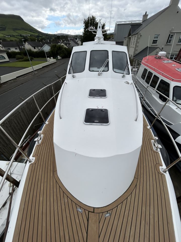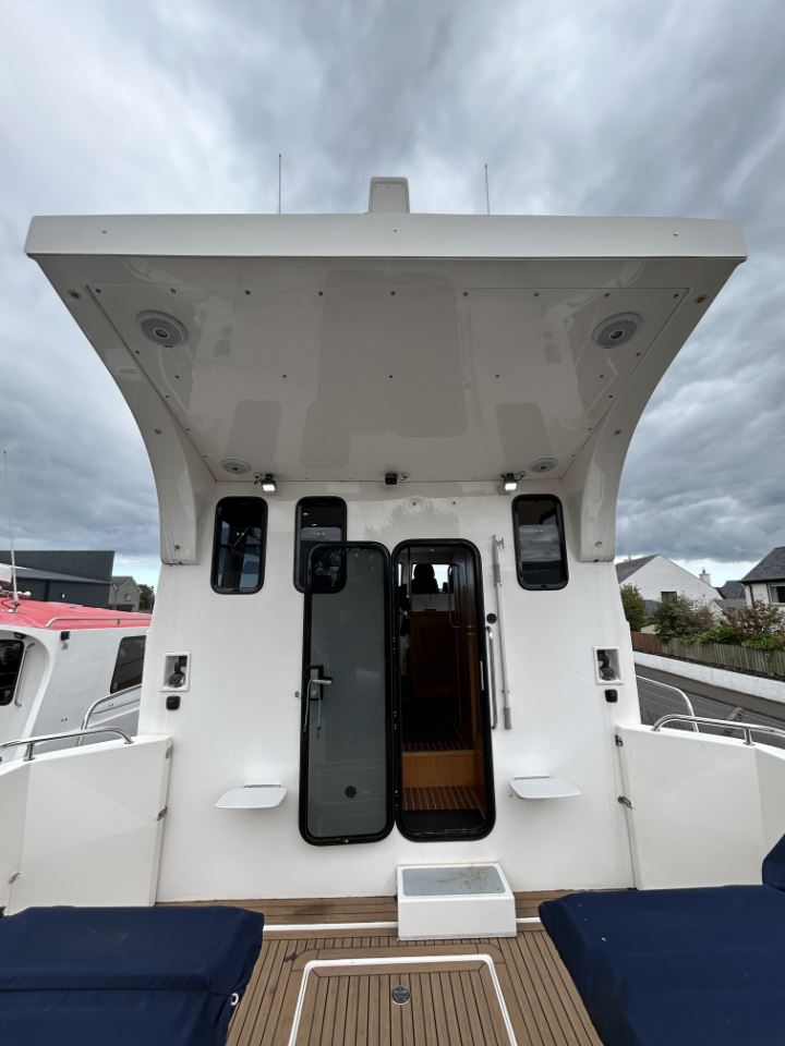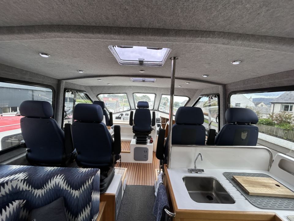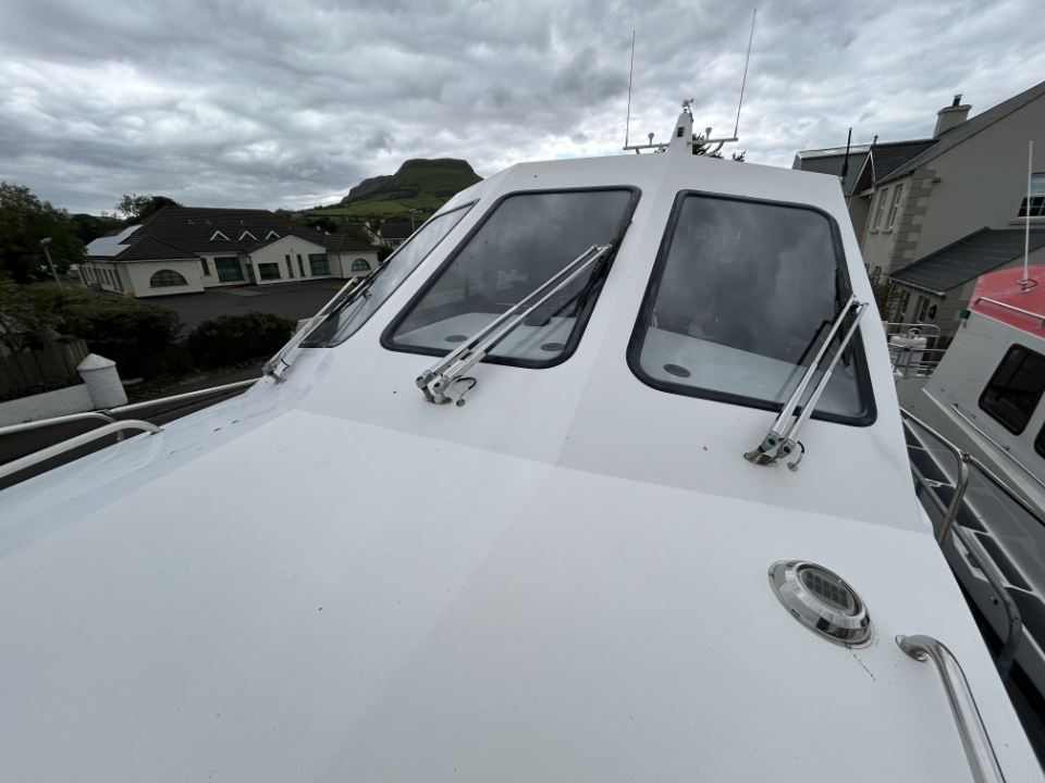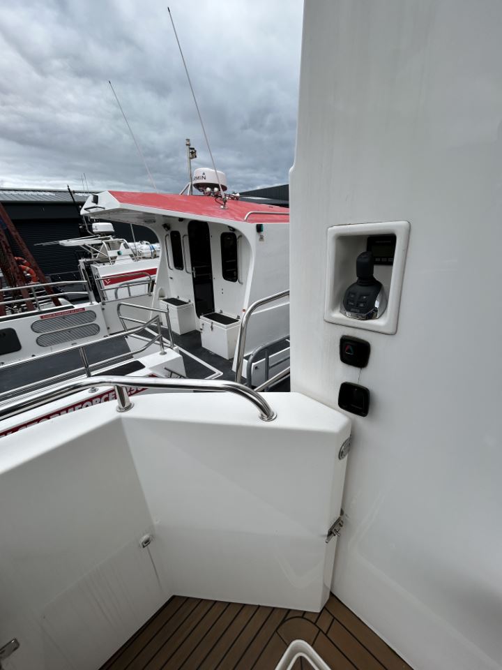 Joe McCollam (Redbay’s tame naval architect) suggested that the first 1650 be built as a pilot boat – high-powered, swift, durable, and built to endure and thrive in savage sea states whilst intercepting massive steel tankers. The moulds (separate hull, deck, and superstructure moulds for versatility and adaptability) were tooled, the hull was massively laminated, and CALEDONIA was born. She headed to the Seawork Show in Southampton, muscling through a Force 8 off Land’s End and 10-metre seas – at a very respectable 18 knots. Her debut provoked a further three orders straight off the bat, followed by a brace of pilot boats for Belfast Harbour and a customer order for passenger trips to St Kilda.