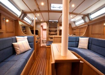Below decks, you descend the companionway to the very well thought through galley to port which has been designed to be the perfect space for cooking at sea. Opposite the galley on the starboard side is the forward facing proper sized chart table. Every detail is thought through. Aft of the chart table is a pilot berth and the day heads. The pilot berth comes with drawers and storage underneath. The heads are also a wet room, practically located at the bottom of the companionway and with specific storage for wet weather gear.