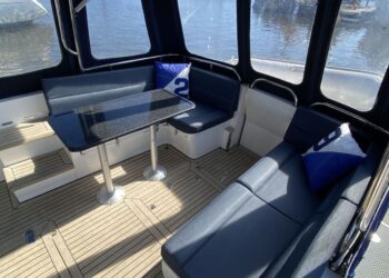Internally – as you would expect, an exquisitely fitted-out saloon leads forward to a commanding helm, with a brace of fully-adjustable, sprung helm seats cosseting the navigator to starboard, and the helm to port. Triple forward screens (double-glazed for safety and best de-misting) are served by heavy-duty Speich pantographing wipers (independently wipe and speed controllable by a pad at the helm chair’s plinth). This is a boat that longs to be driven a decent distance.