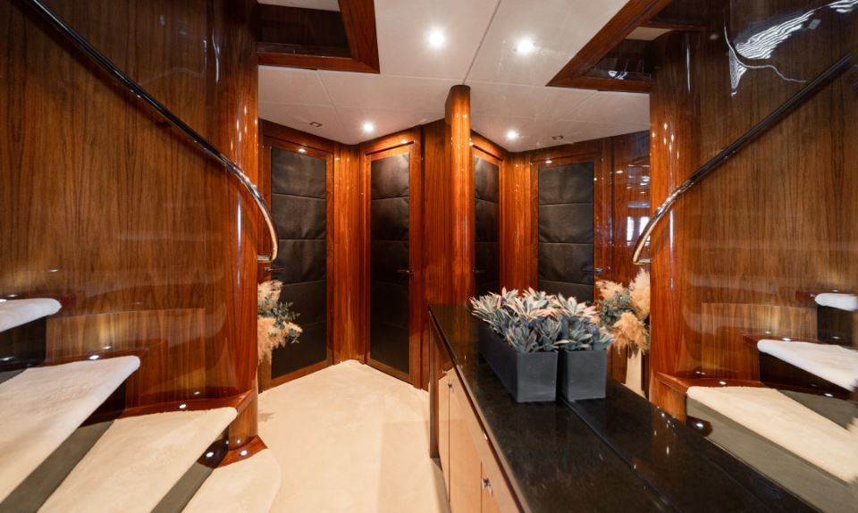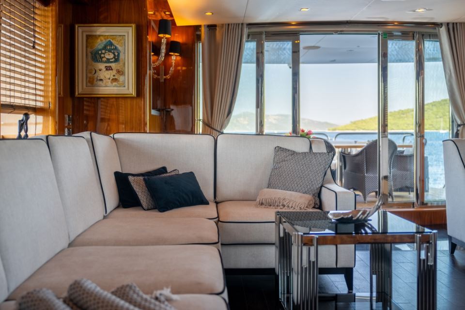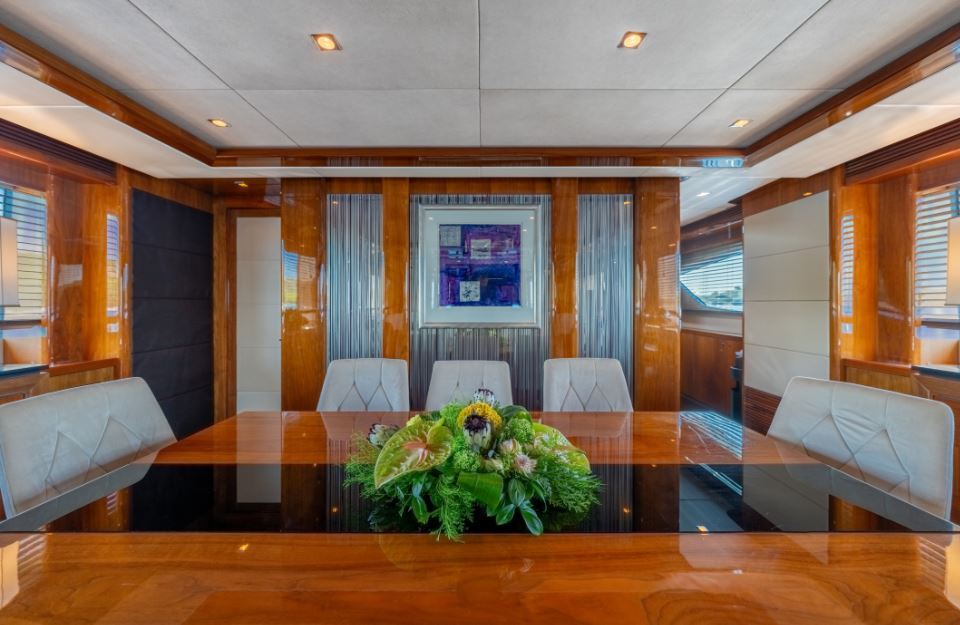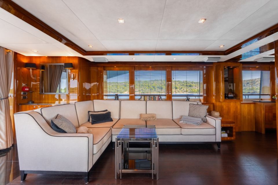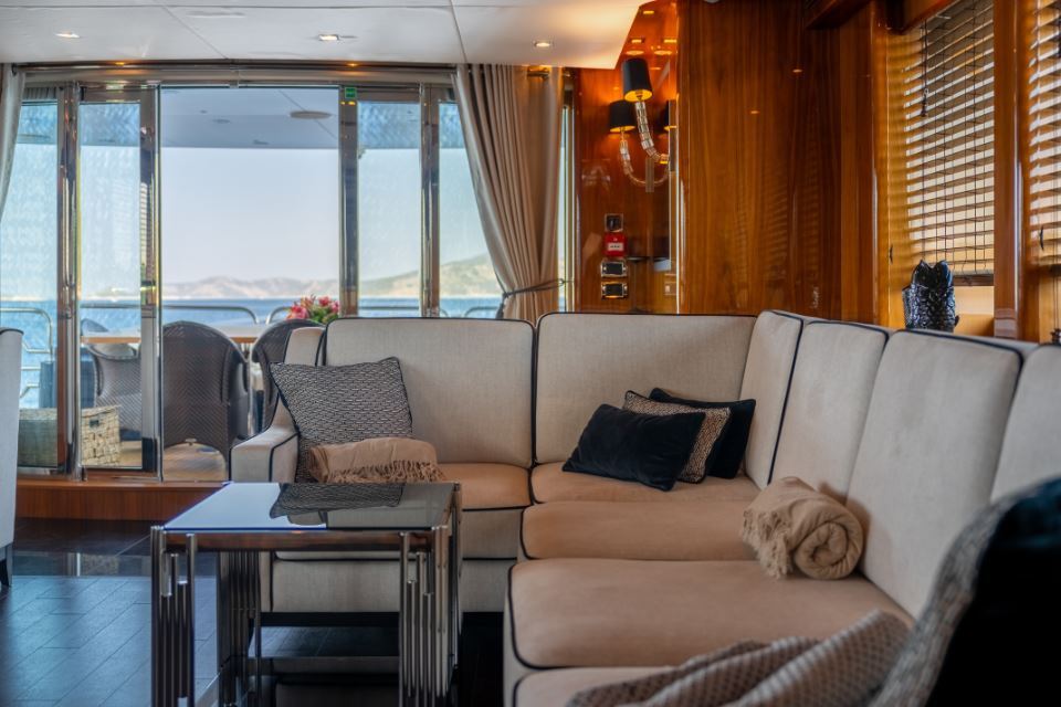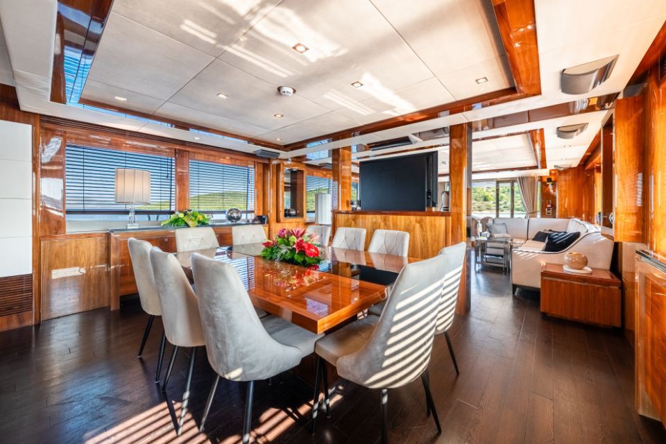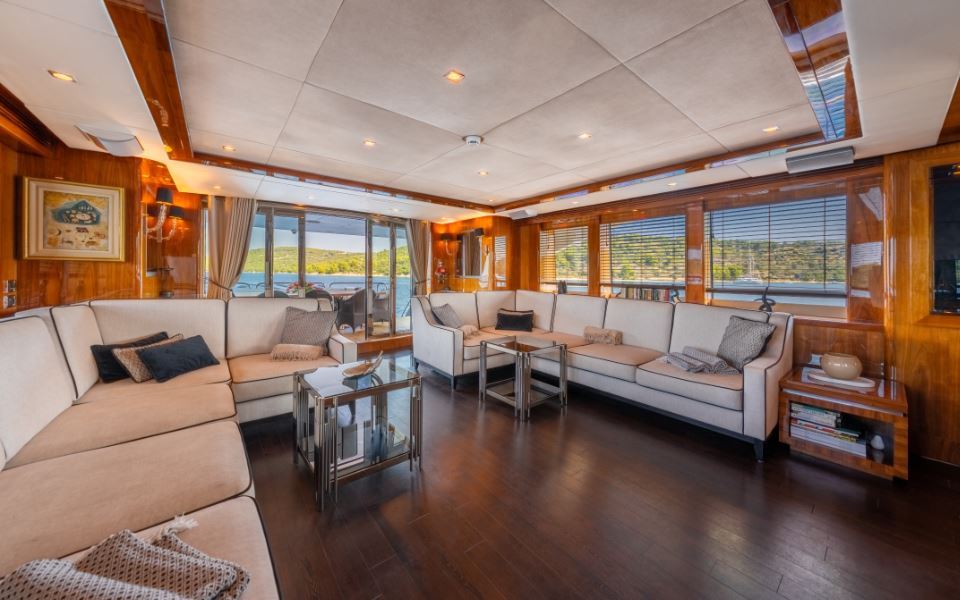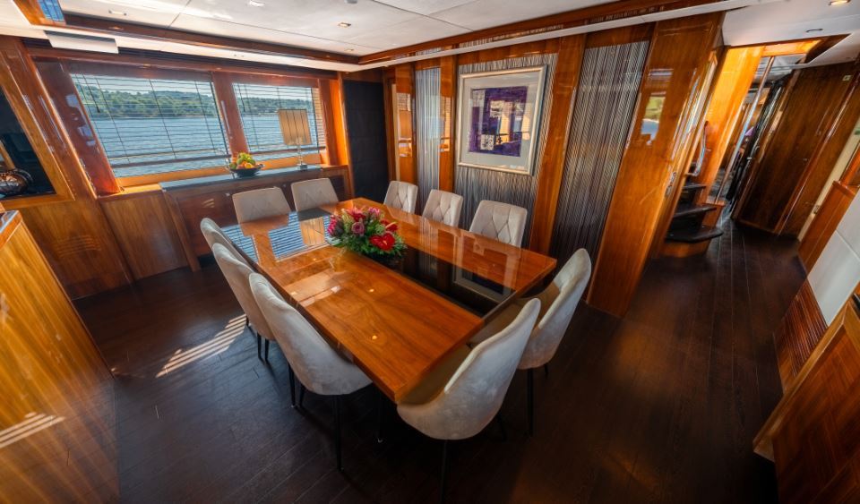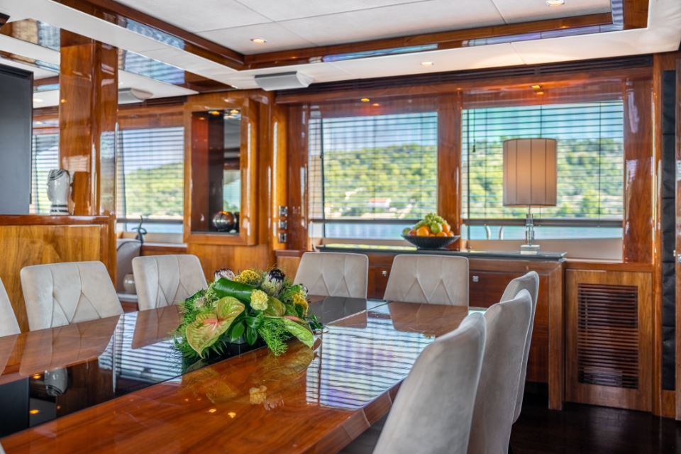 Her interiors are a masterclass in high-gloss American walnut, bespoke detailing, and refined spatial design across three expansive decks. ARAGO accommodates up to 10 guests in five elegant staterooms, including a full-beam main deck master suite complete with walk-in wardrobe and Jacuzzi bath. The main salon is flooded with natural light through full-height windows and features a formal dining area for 10, with discreet galley access to ensure seamless service for guests.