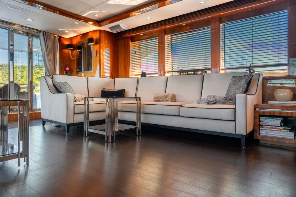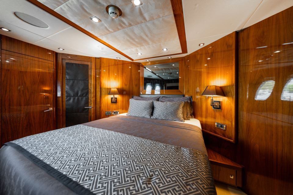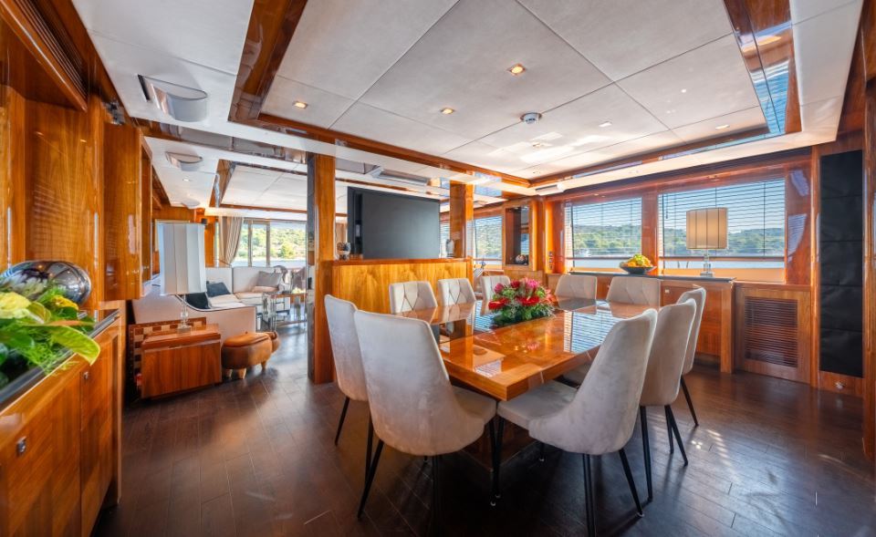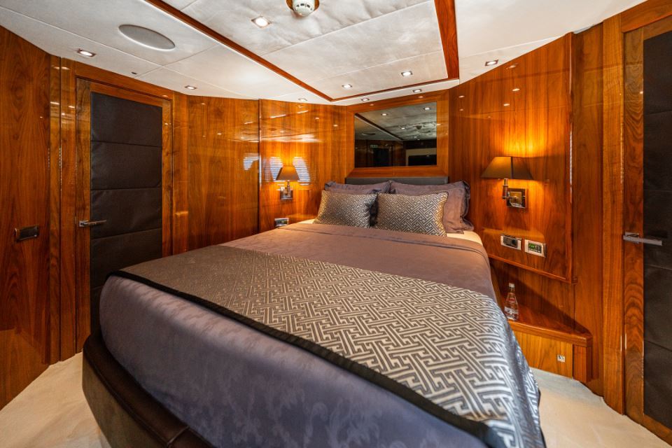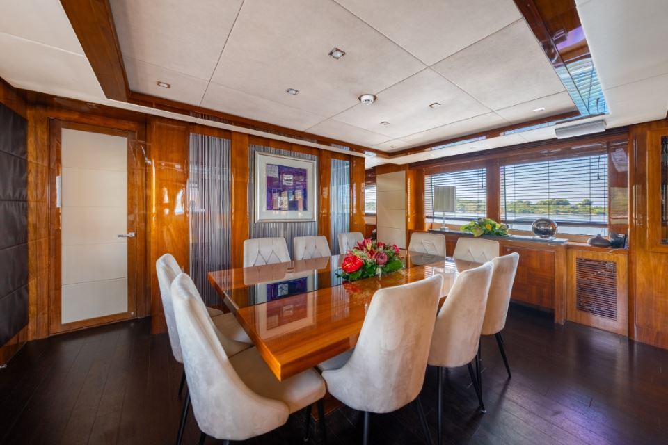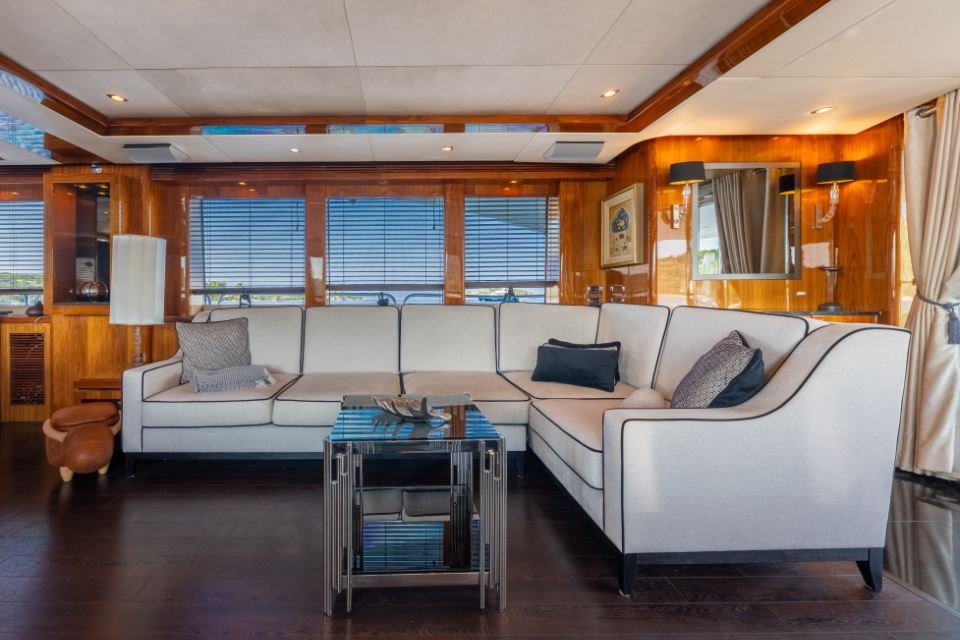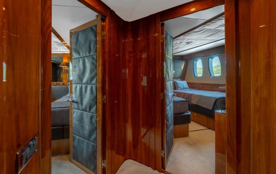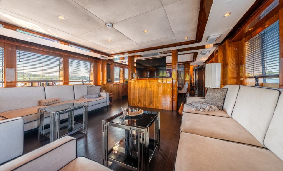 Her interiors are a masterclass in high-gloss American walnut, bespoke detailing, and refined spatial design across three expansive decks. ARAGO accommodates up to 10 guests in five elegant staterooms, including a full-beam main deck master suite complete with walk-in wardrobe and Jacuzzi bath. The main salon is flooded with natural light through full-height windows and features a formal dining area for 10, with discreet galley access to ensure seamless service for guests.