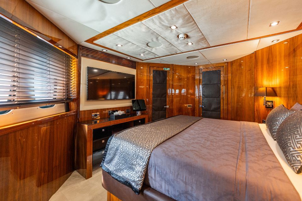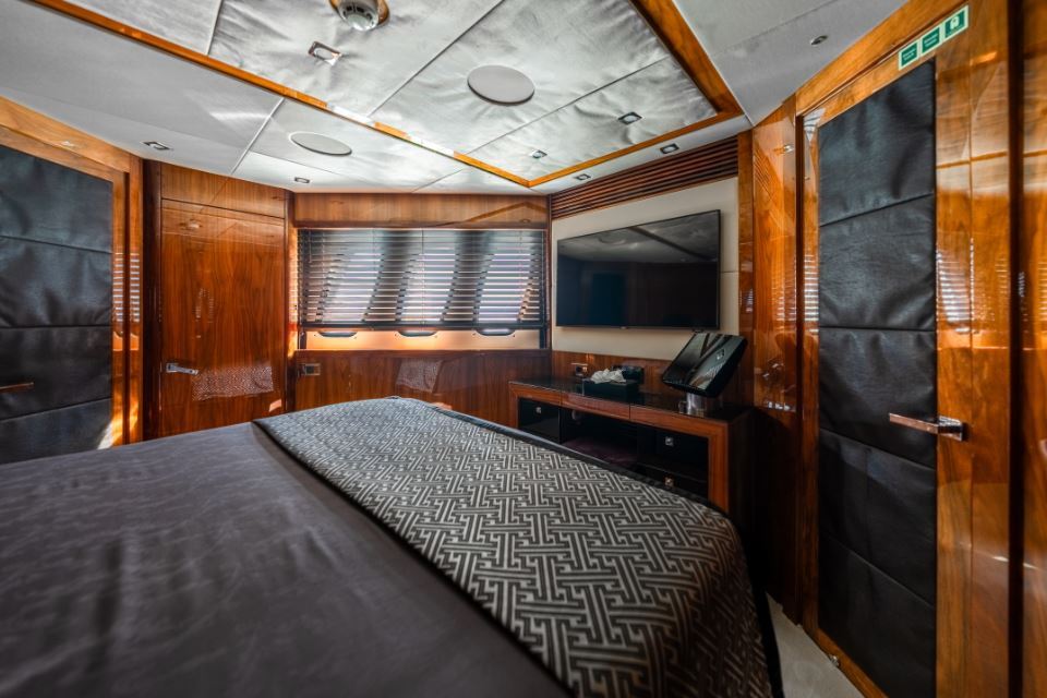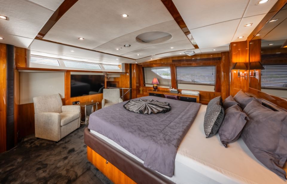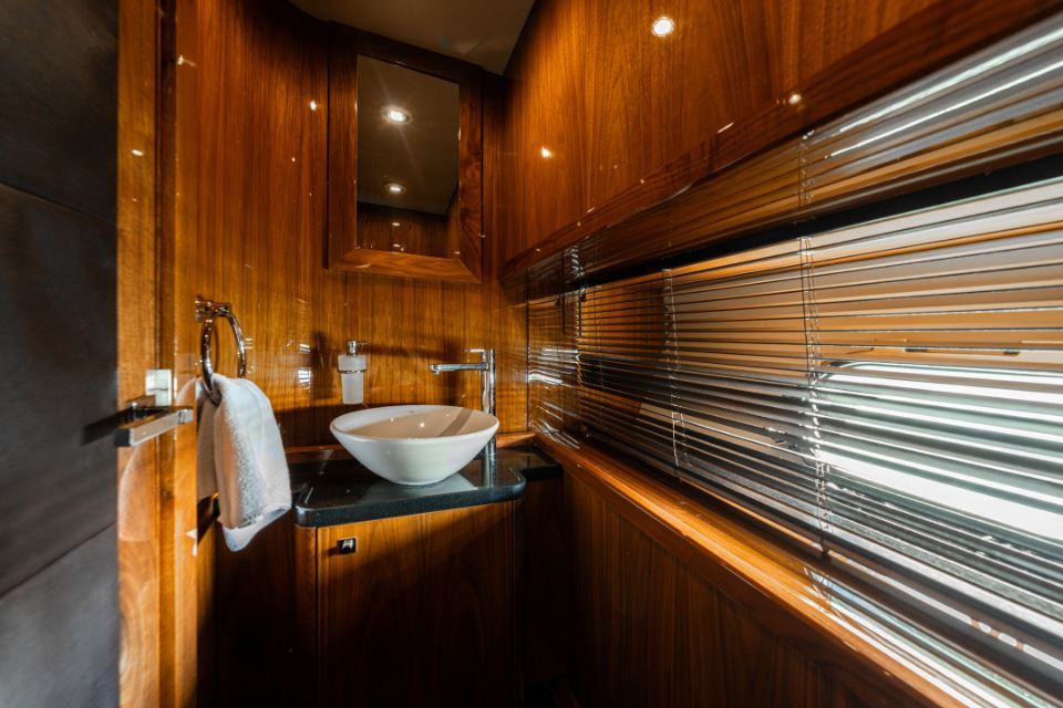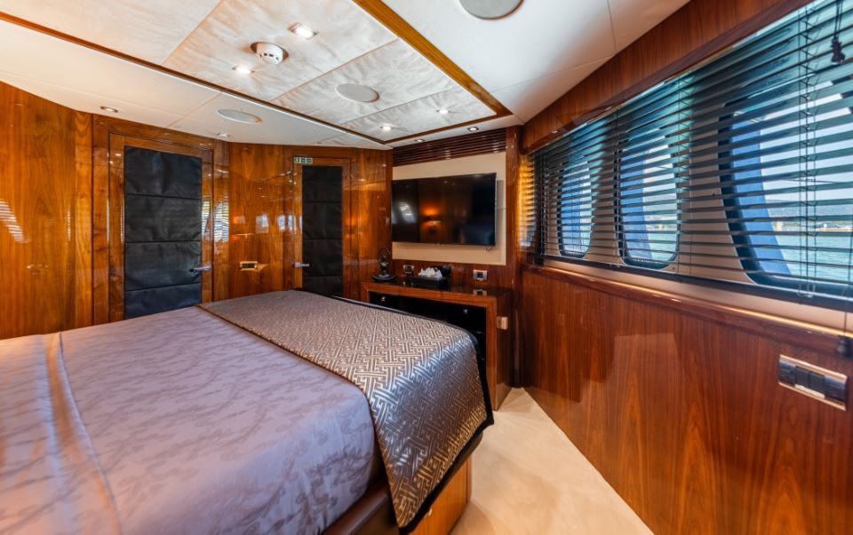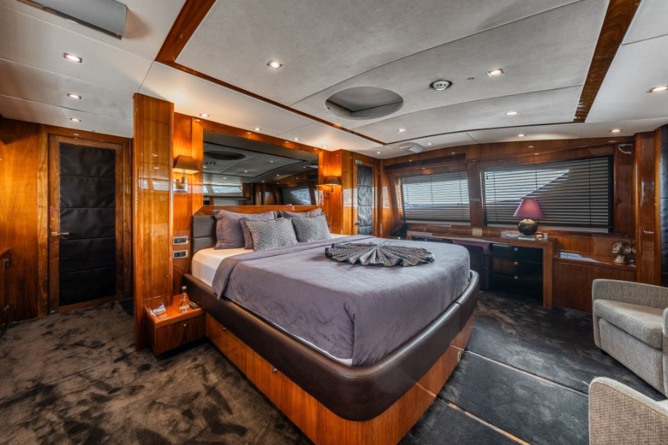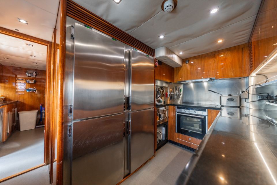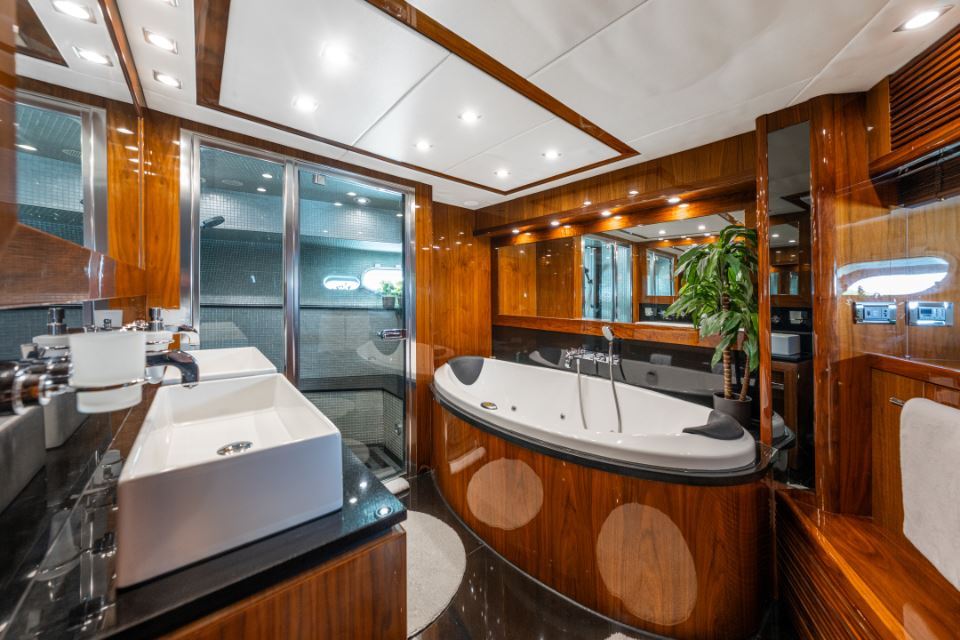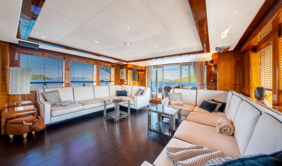Her interiors are a masterclass in high-gloss American walnut, bespoke detailing, and refined spatial design across three expansive decks. ARAGO accommodates up to 10 guests in five elegant staterooms, including a full-beam main deck master suite complete with walk-in wardrobe and Jacuzzi bath. The main salon is flooded with natural light through full-height windows and features a formal dining area for 10, with discreet galley access to ensure seamless service for guests.