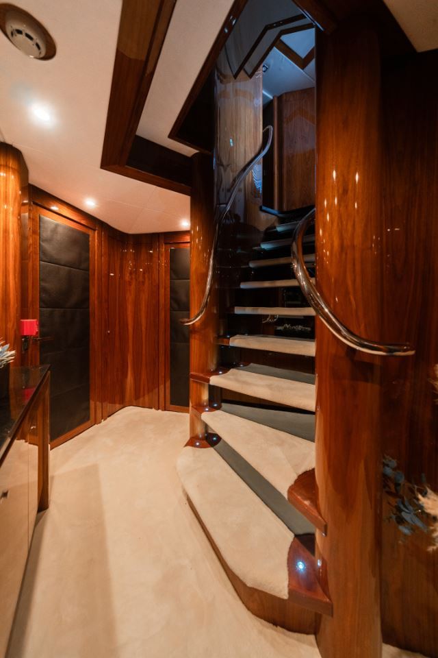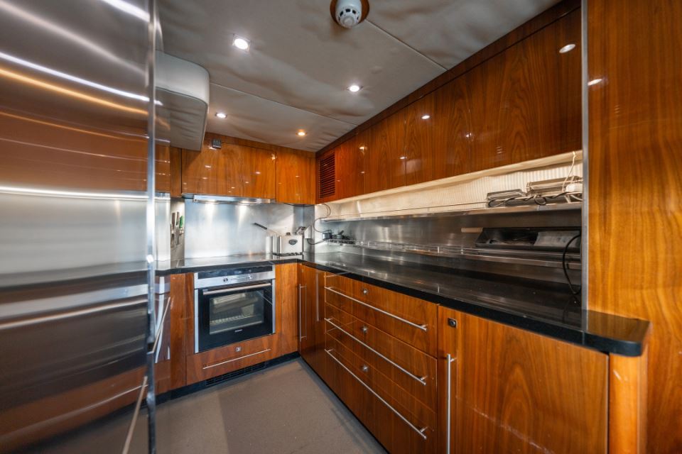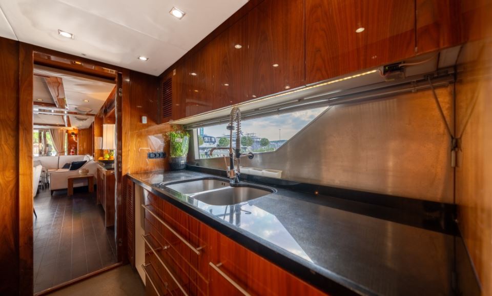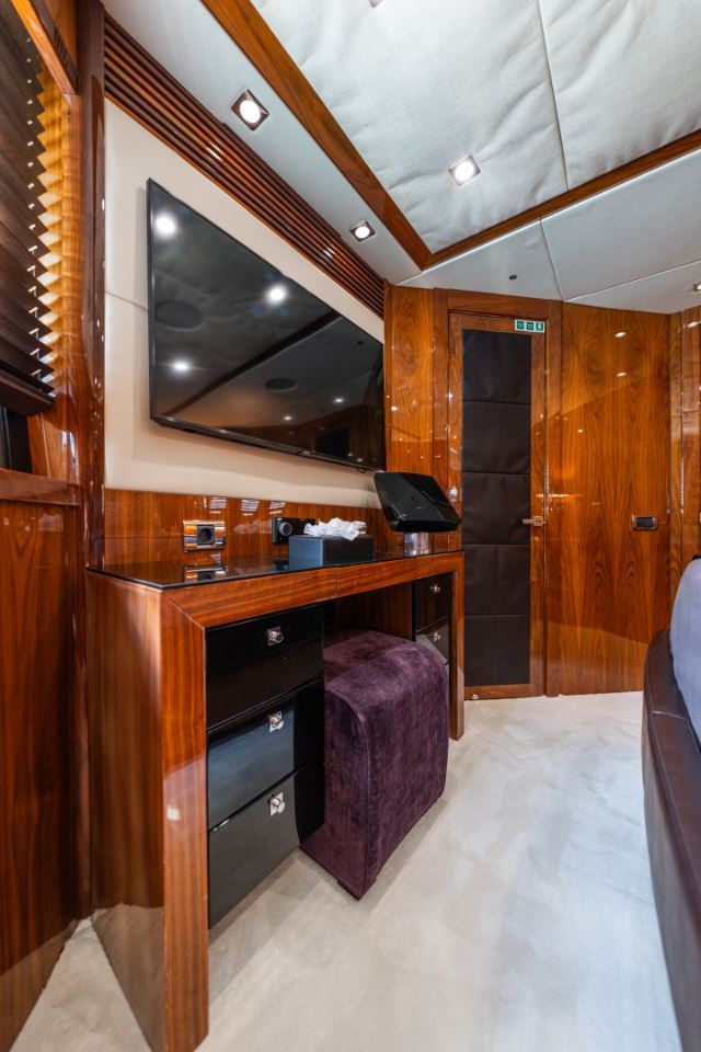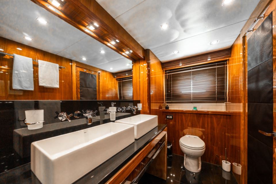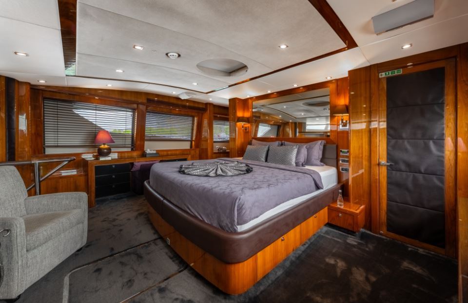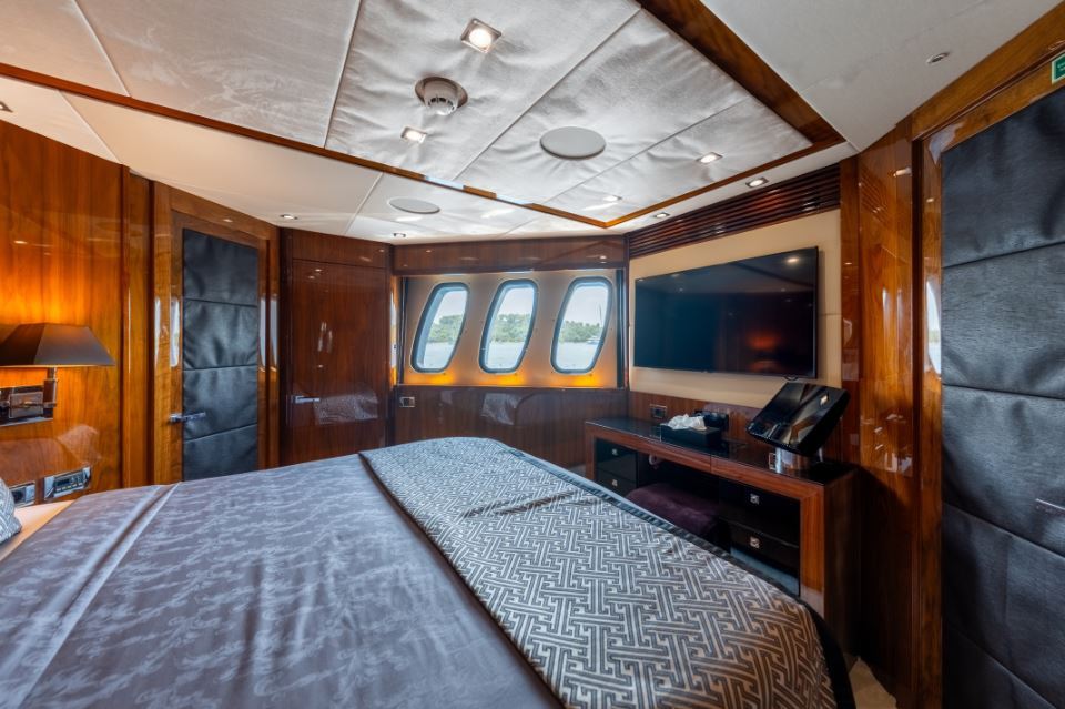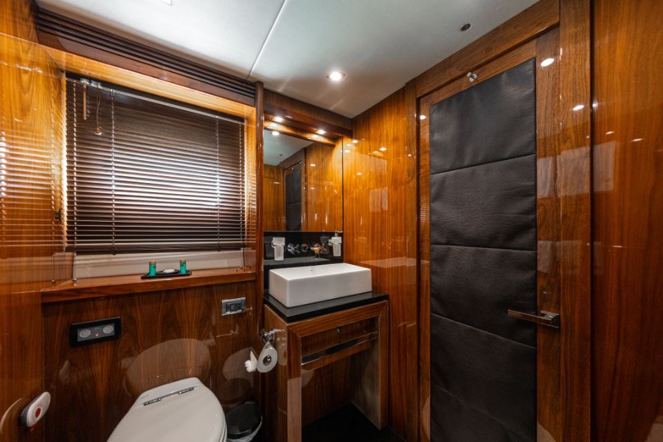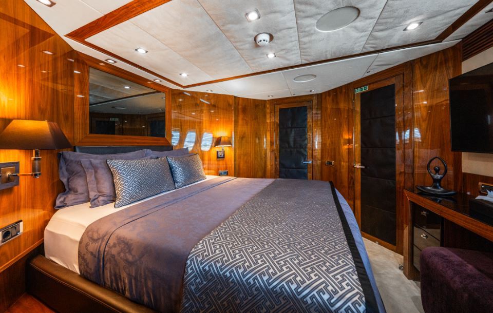 Her interiors are a masterclass in high-gloss American walnut, bespoke detailing, and refined spatial design across three expansive decks. ARAGO accommodates up to 10 guests in five elegant staterooms, including a full-beam main deck master suite complete with walk-in wardrobe and Jacuzzi bath. The main salon is flooded with natural light through full-height windows and features a formal dining area for 10, with discreet galley access to ensure seamless service for guests.