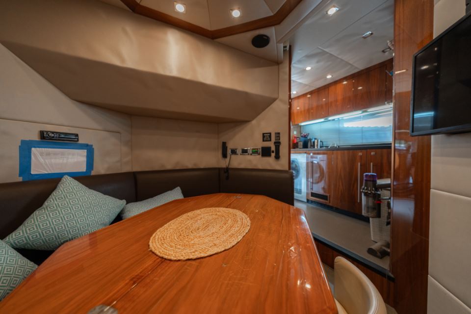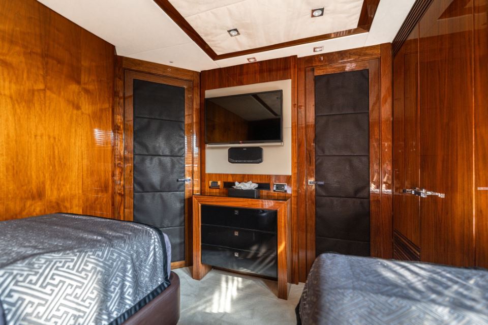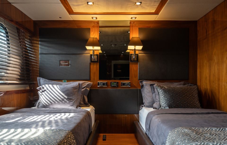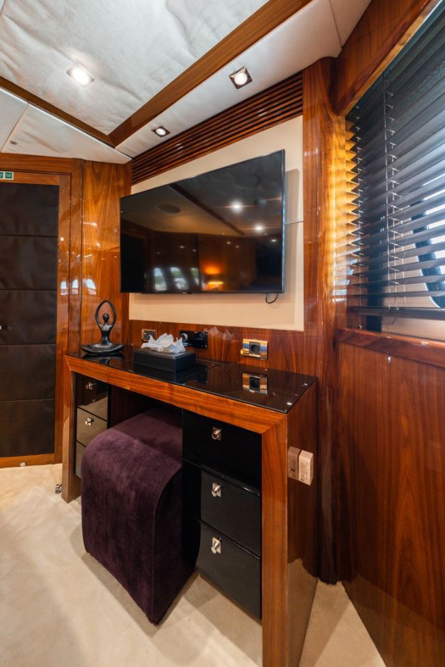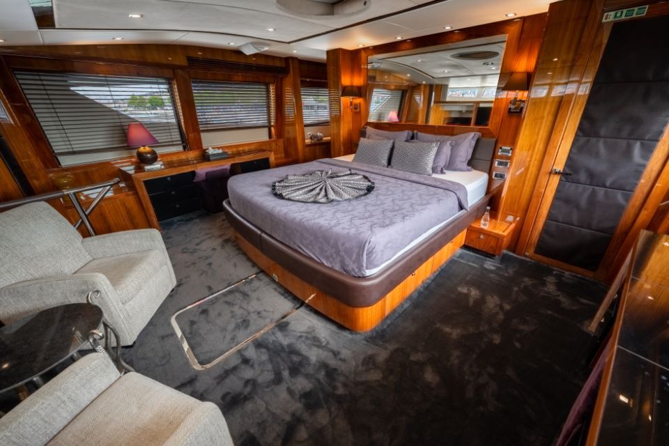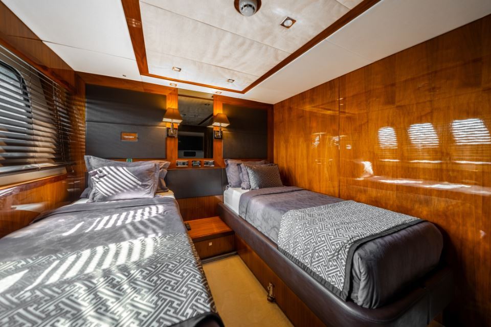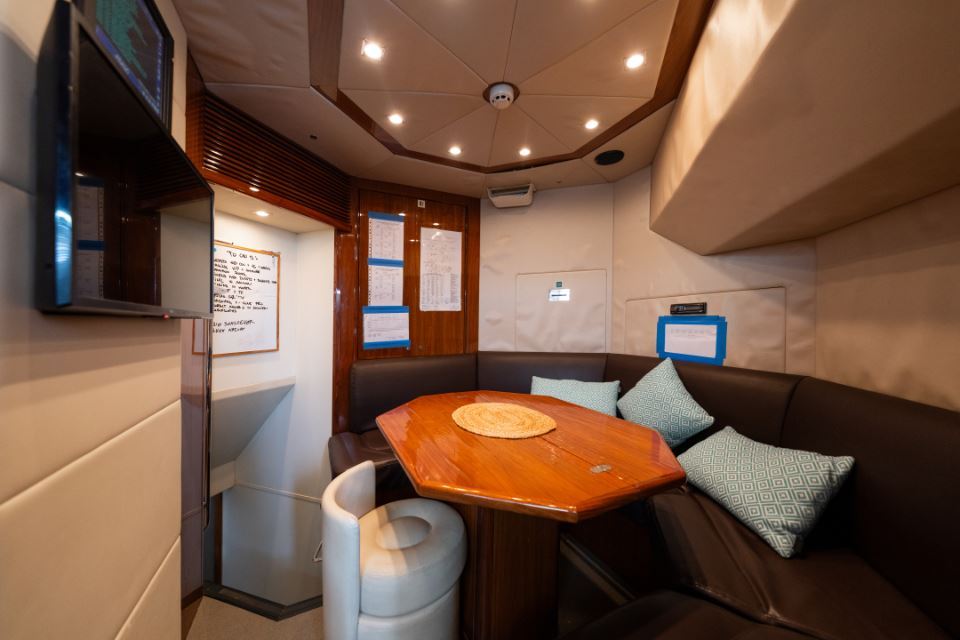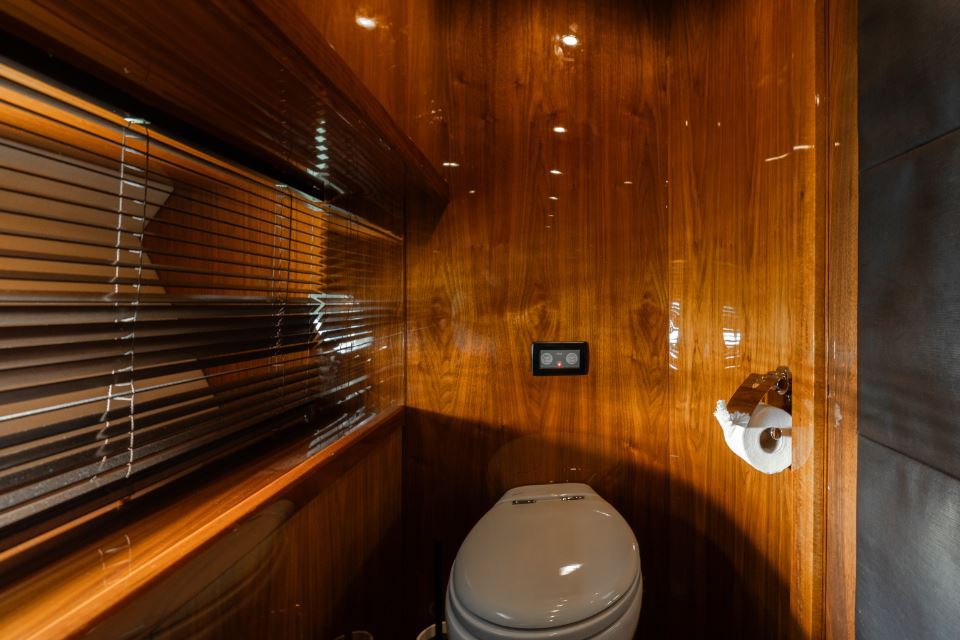 Her interiors are a masterclass in high-gloss American walnut, bespoke detailing, and refined spatial design across three expansive decks. ARAGO accommodates up to 10 guests in five elegant staterooms, including a full-beam main deck master suite complete with walk-in wardrobe and Jacuzzi bath. The main salon is flooded with natural light through full-height windows and features a formal dining area for 10, with discreet galley access to ensure seamless service for guests.
