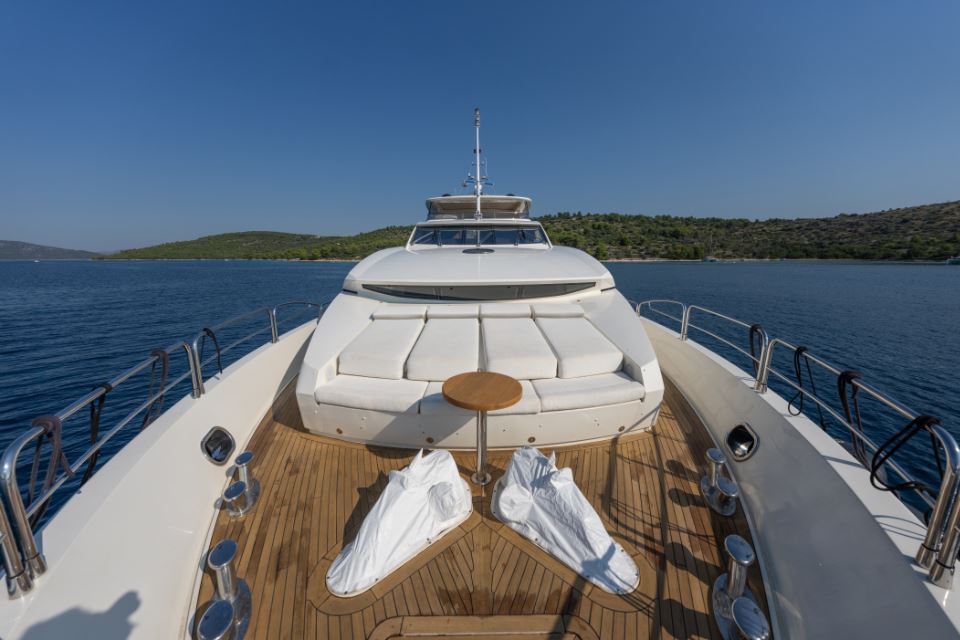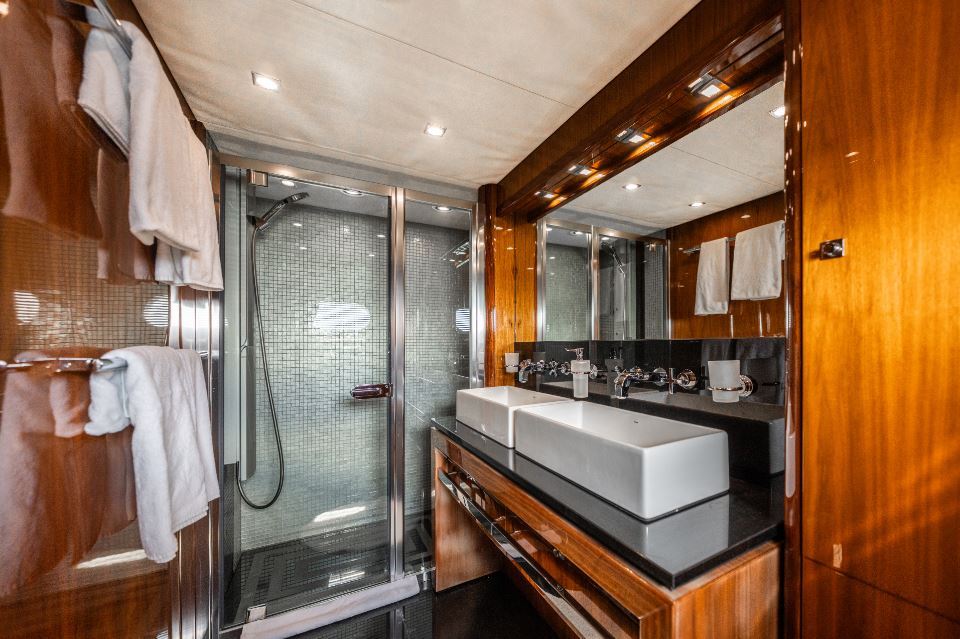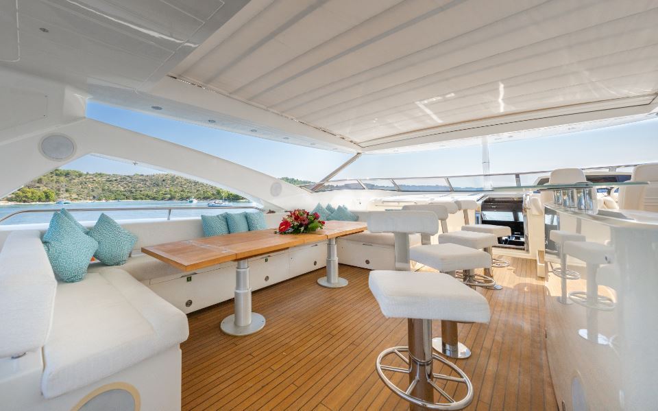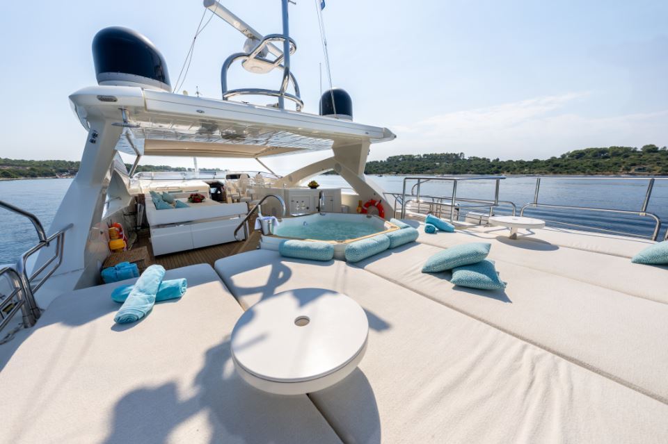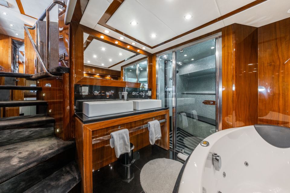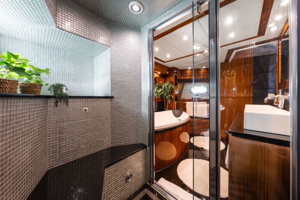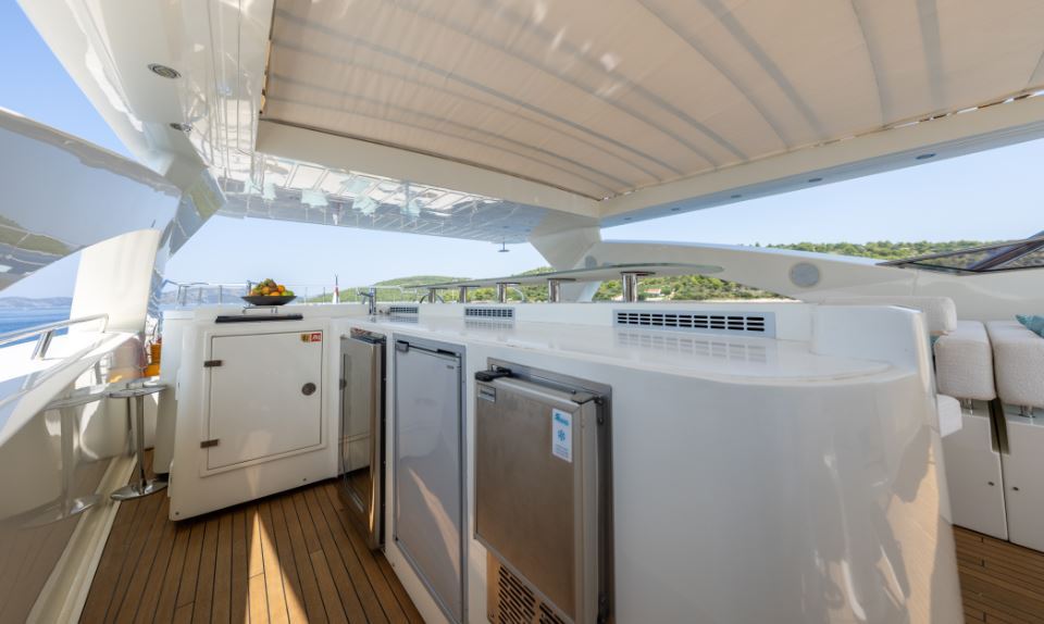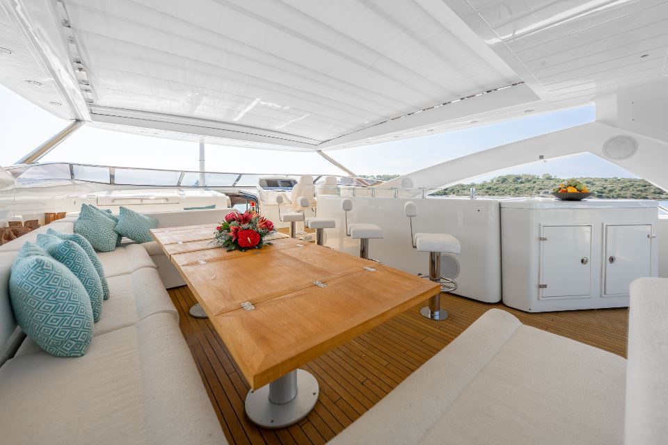 ARAGO’s outdoor spaces are equally impressive. The expansive flybridge, a true highlight, is designed for both relaxation and entertaining, featuring a retractable sunroof, Jacuzzi, sit-up bar, rainfall shower, generous sunpads, and al fresco dining for 12. With ample seating and lounging areas, it offers a private sanctuary under open skies, while the foredeck adds an additional intimate space with a sunpad and drinks table.