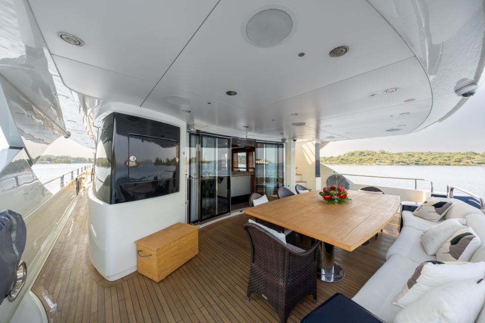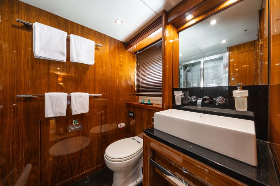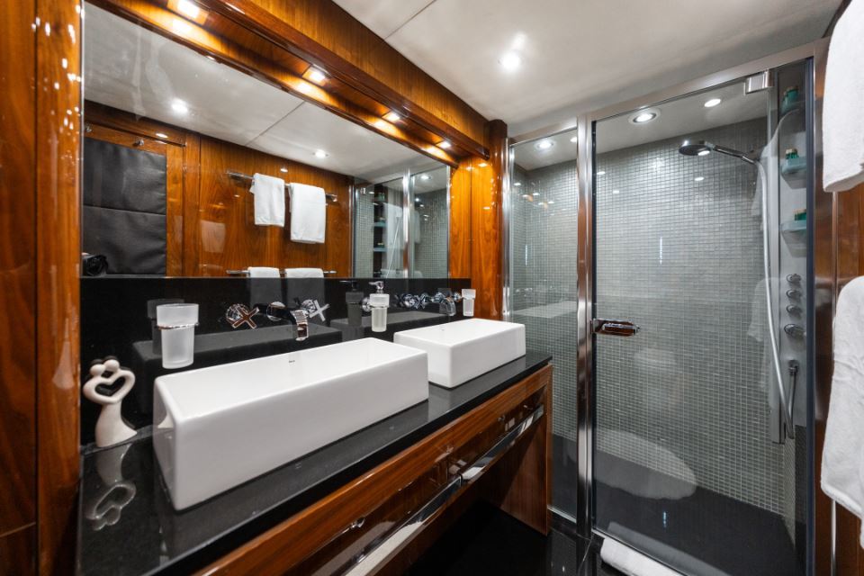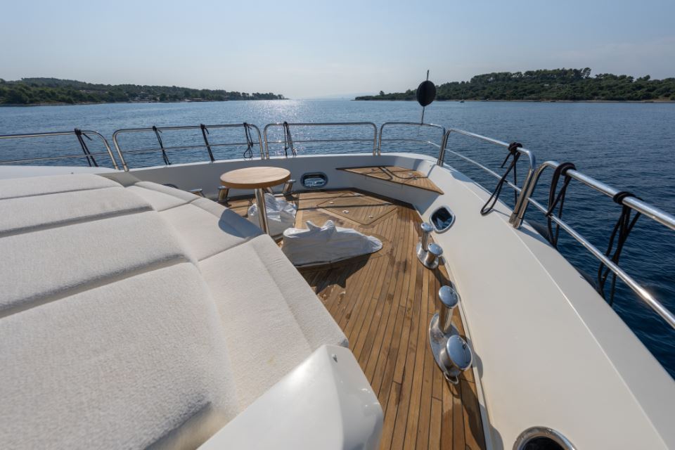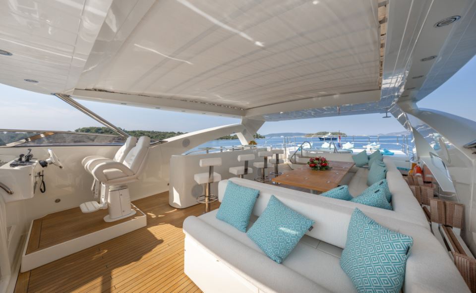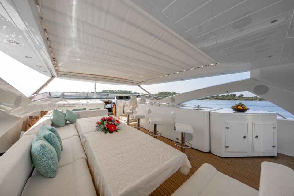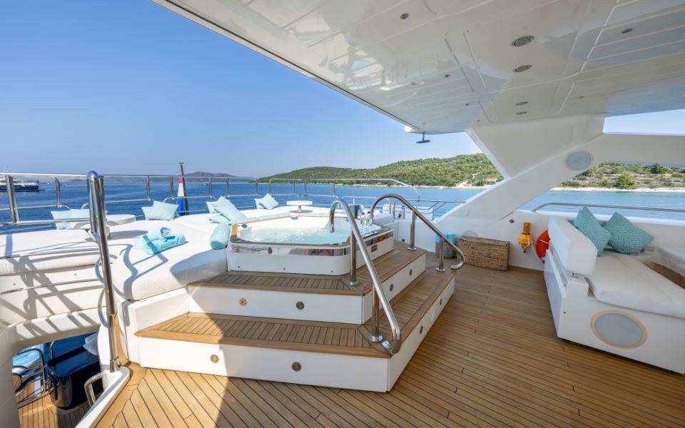 ARAGO’s outdoor spaces are equally impressive. The expansive flybridge, a true highlight, is designed for both relaxation and entertaining, featuring a retractable sunroof, Jacuzzi, sit-up bar, rainfall shower, generous sunpads, and al fresco dining for 12. With ample seating and lounging areas, it offers a private sanctuary under open skies, while the foredeck adds an additional intimate space with a sunpad and drinks table.
