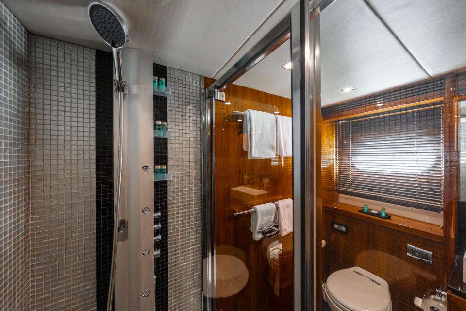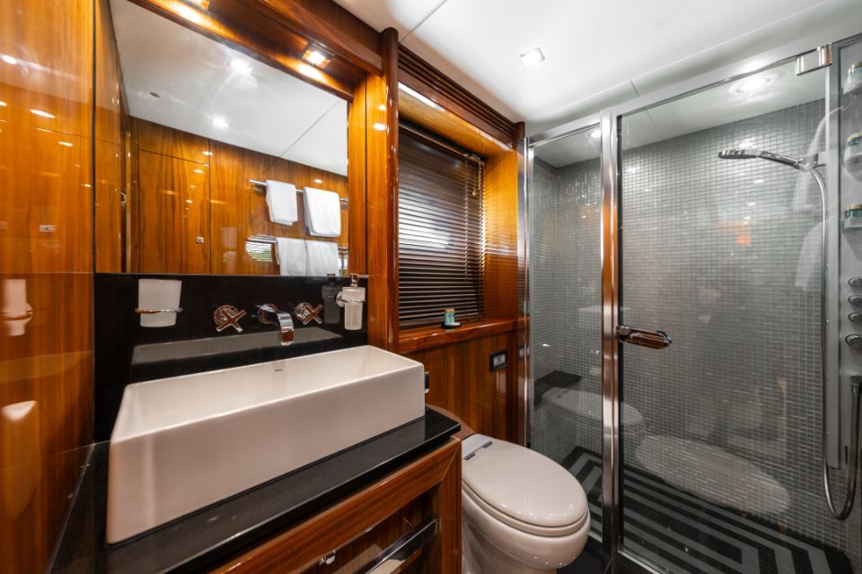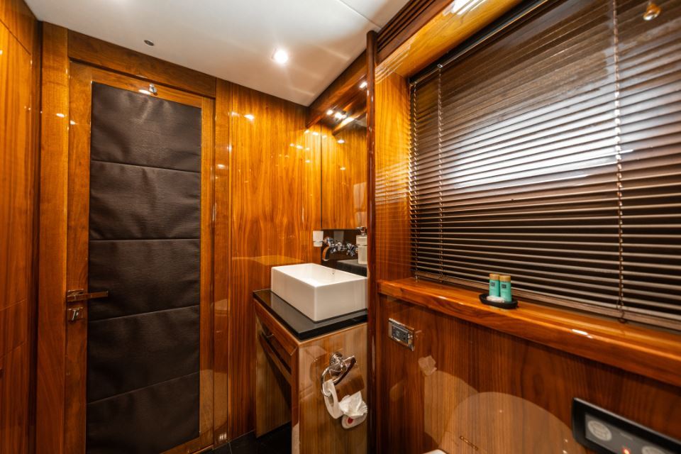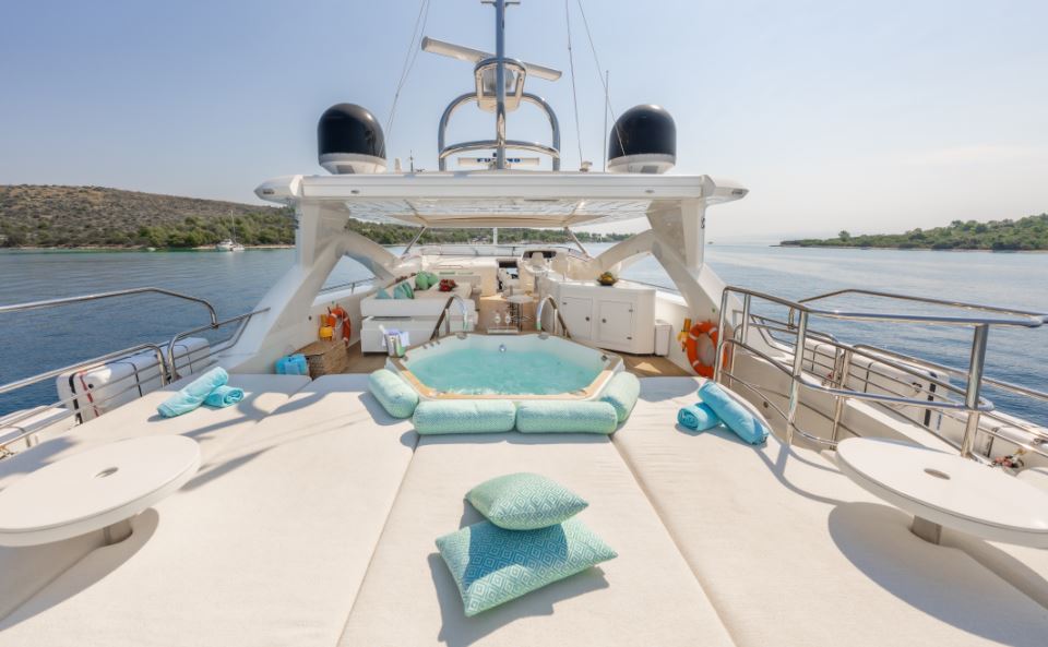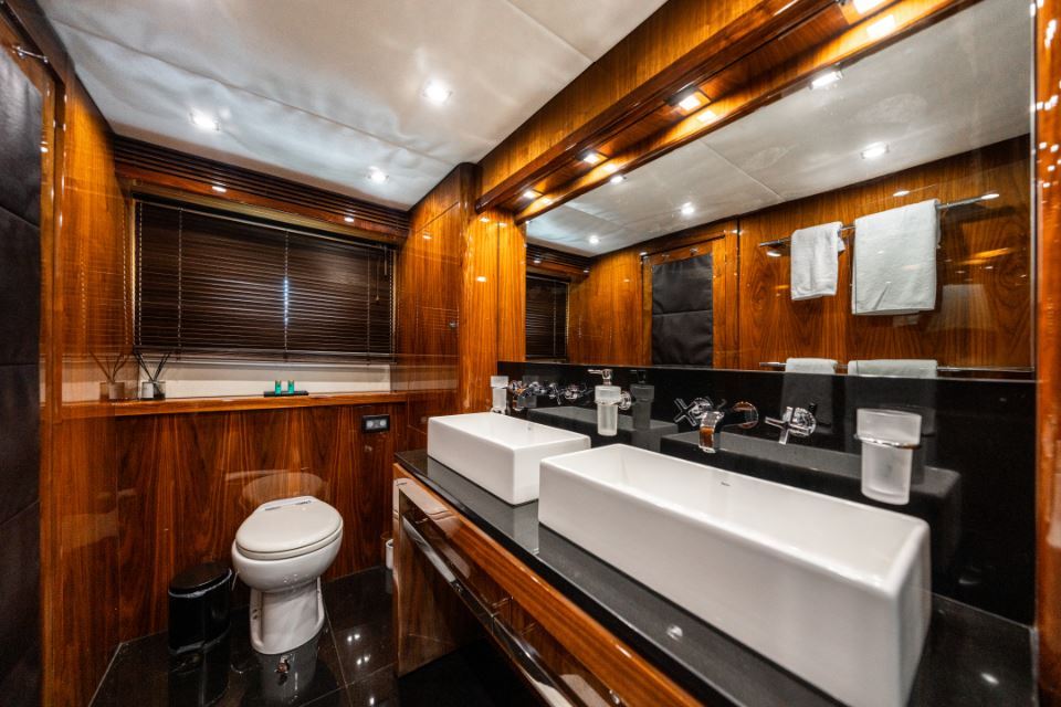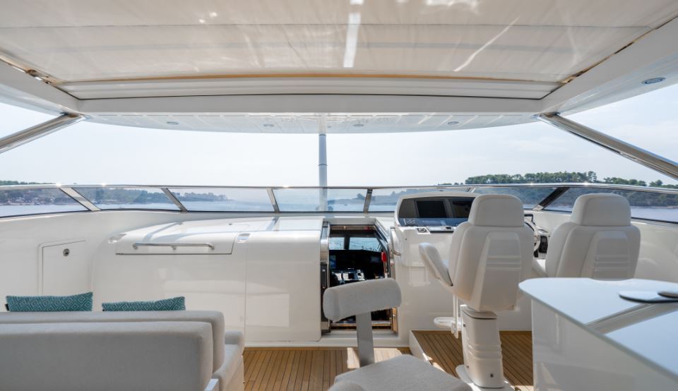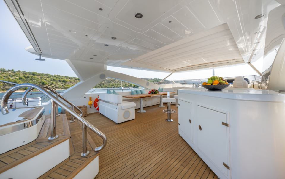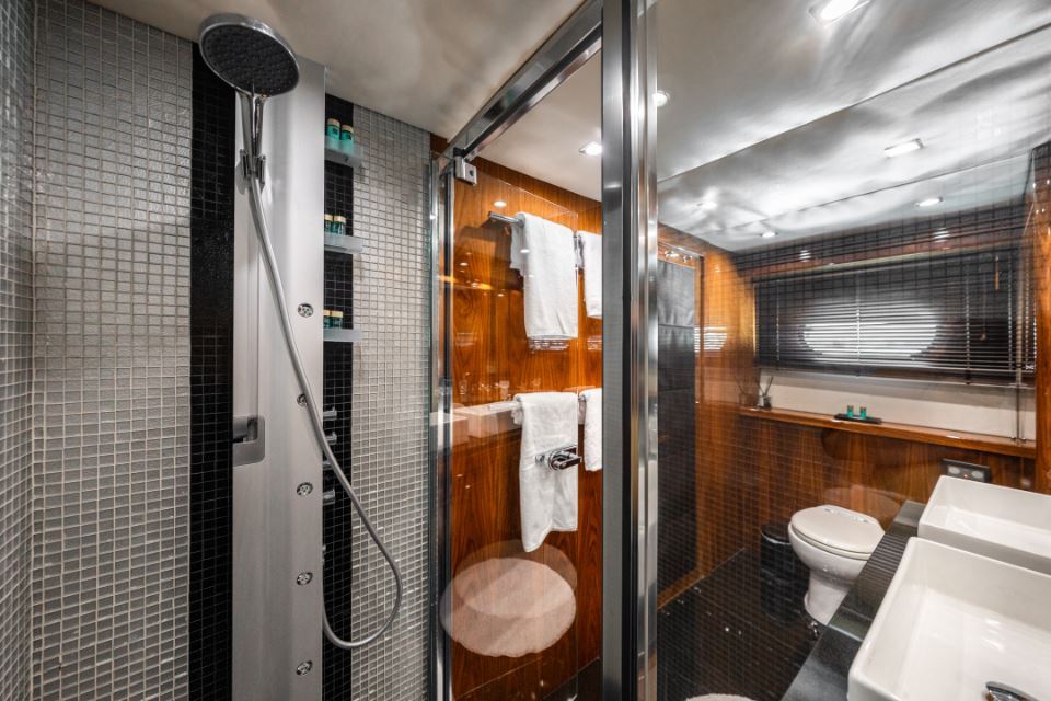 ARAGO’s outdoor spaces are equally impressive. The expansive flybridge, a true highlight, is designed for both relaxation and entertaining, featuring a retractable sunroof, Jacuzzi, sit-up bar, rainfall shower, generous sunpads, and al fresco dining for 12. With ample seating and lounging areas, it offers a private sanctuary under open skies, while the foredeck adds an additional intimate space with a sunpad and drinks table.
