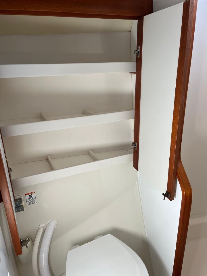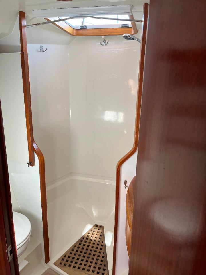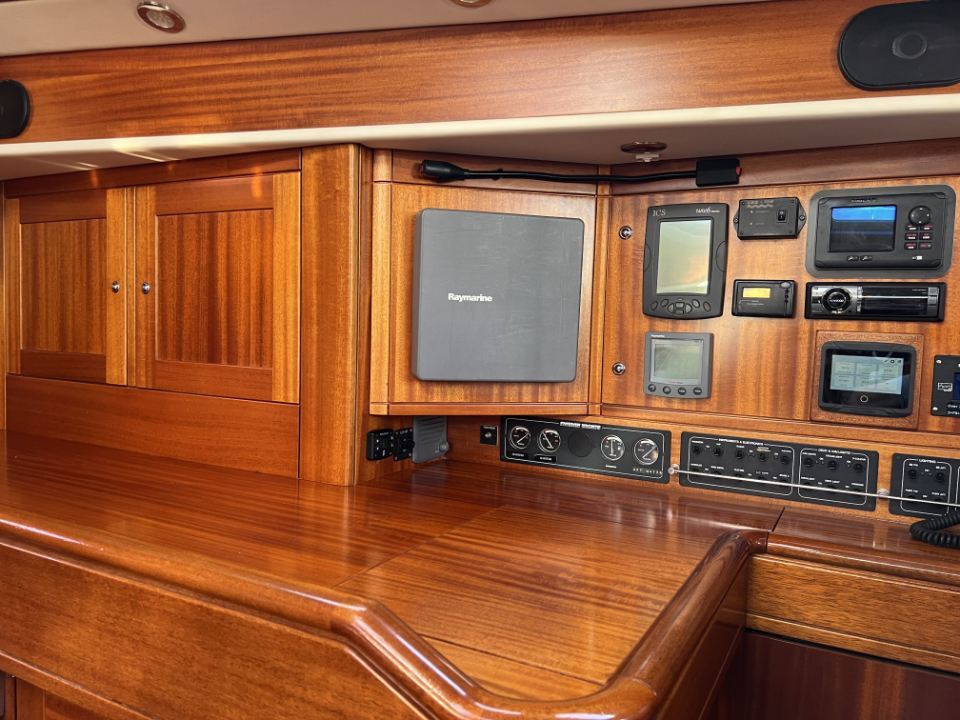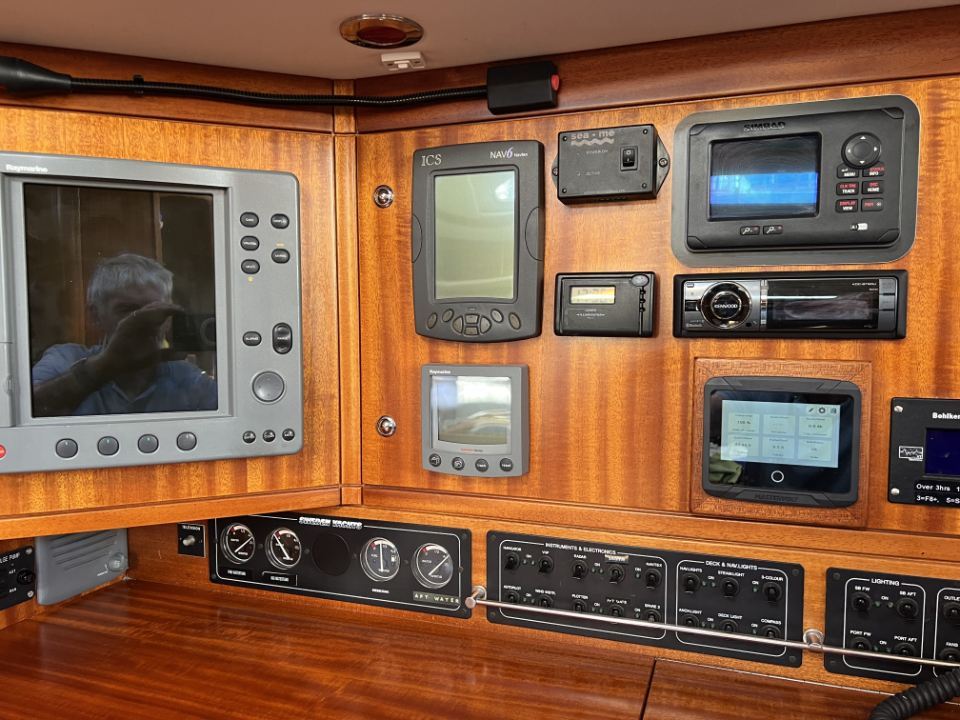 Accommodation includes three double cabins, two heads with electric toilets, and shower with generator and watermaker allowing freedom of cruising, along with a forward-facing chart table in a spacious saloon. Both above and below deck, she offers unusually generous stowage space, including two large lazarettes aft and a substantial forward lazarette.