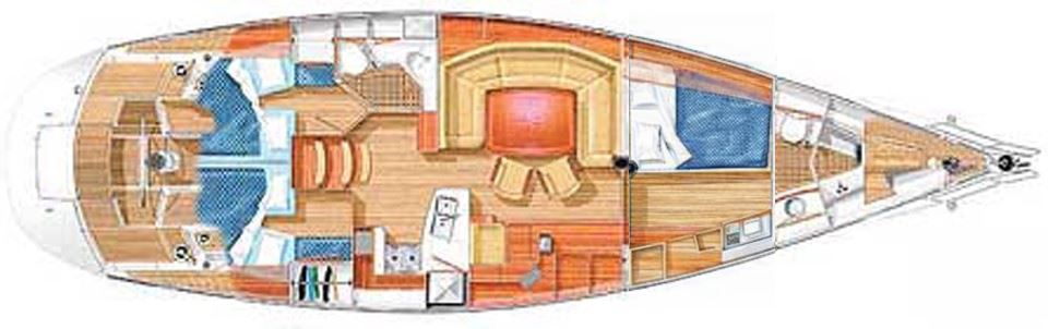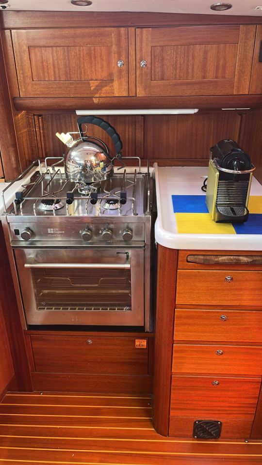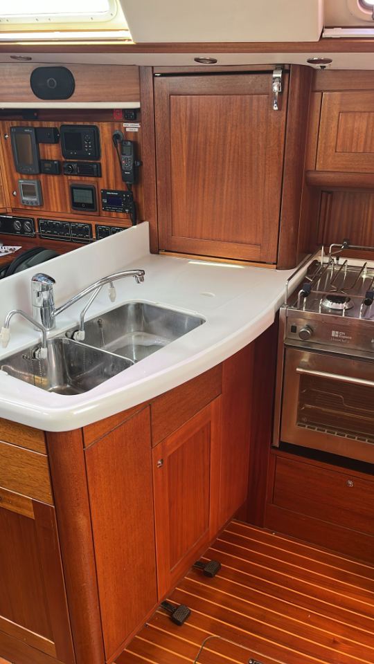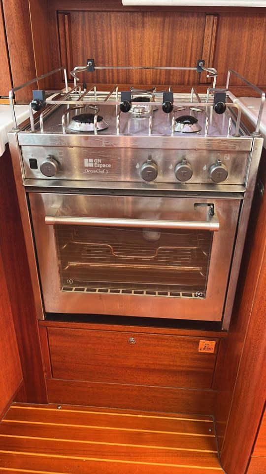 Easily and comfortably sailed short-handed, she has a fully-battened mainsail, with both a self-tacking jib, all controlled by electric winches from the secure aft cockpit. Below decks, she features an L-shaped galley with two fridges and one fridge/freezer, a modern gas cooker and oven.