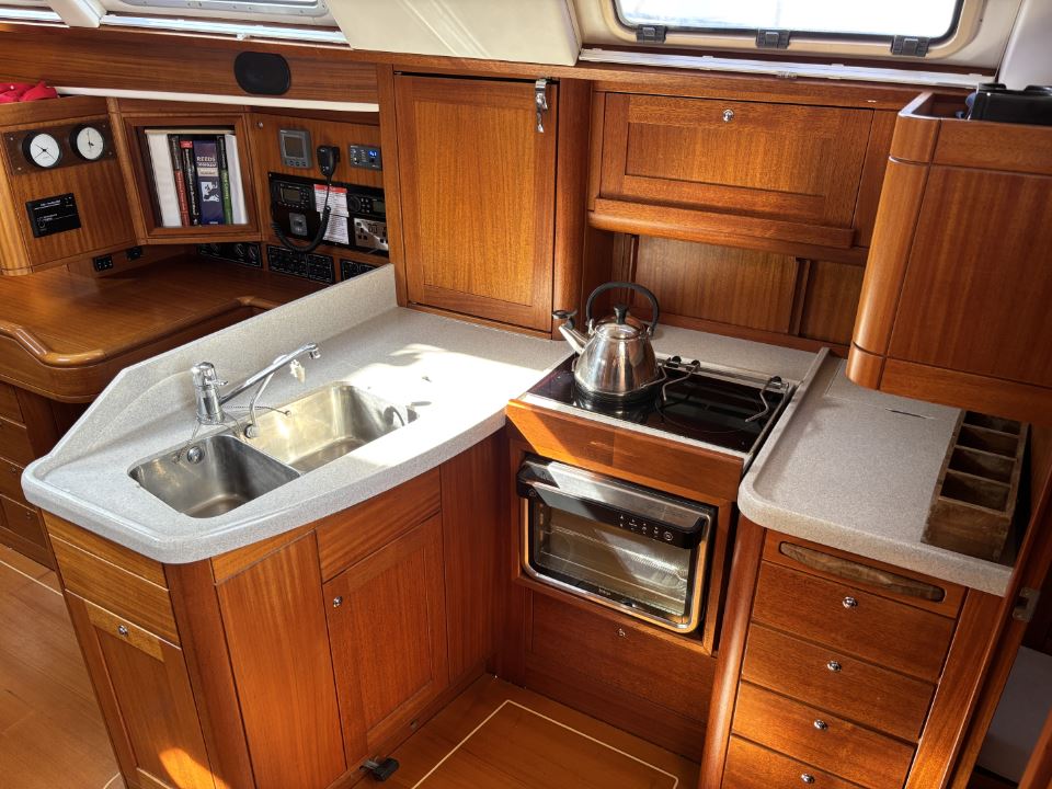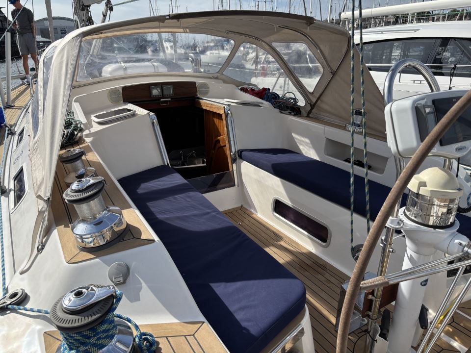 Easily and comfortably sailed short-handed, she has a fully-battened mainsail, along with both a self-tacking jib and an overlapping genoa — all controlled by an electric winch. Below decks, she features an L-shaped galley with two fridges, an electric induction hob, and a multi-function oven. Accommodation includes three double cabins, two heads, and a recently re-upholstered leather dinette, along with a forward-facing chart table in a spacious saloon. Both above and below deck, she offers unusually generous stowage space, including three large lazarettes aft and a substantial forward locker.