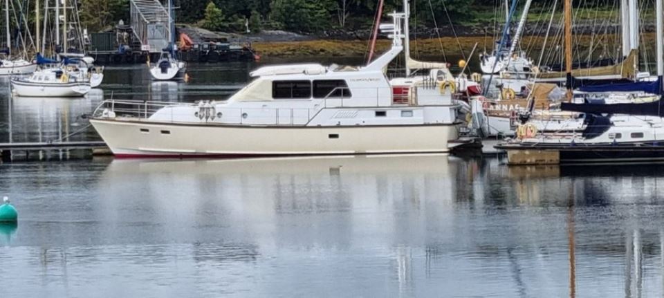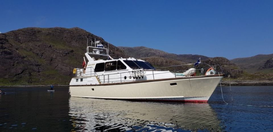Using an exceptionally capable semi-displacement, sea-going hull form designed by Scotland’s legendary Murray Cormack Associates, the Talisman 49, TALISMAN OF WIGHT, is a fully prepared, all-weather sea boat. She has cruised very successfully around the stunning Western Isles, where a bit of weather is par for the course, and is currently laid up in Dunstaffnage.