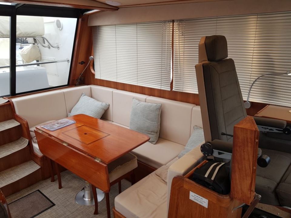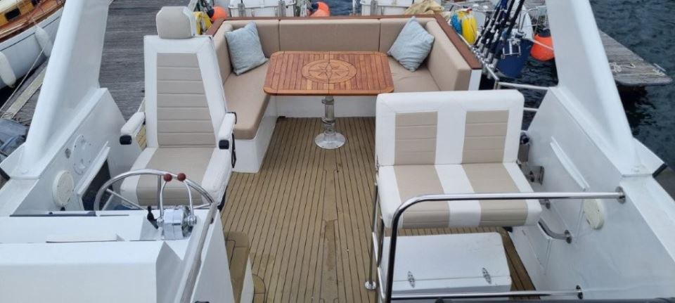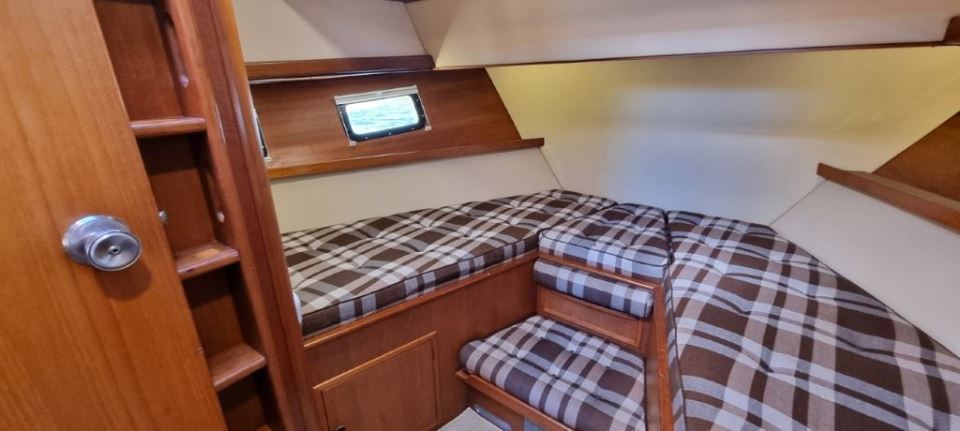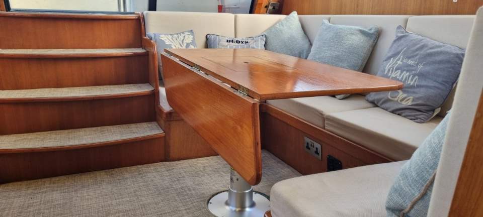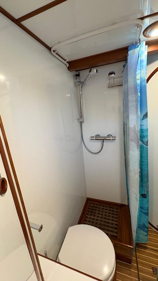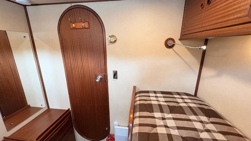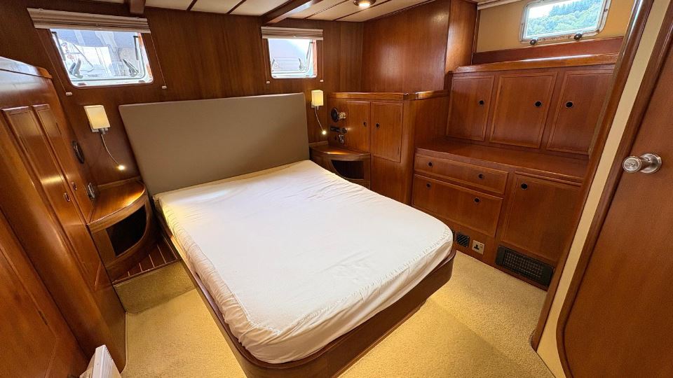 Her interior was fitted out by Moodys of Swanwick, with typically stout teak cabinetry and beautifully radiused mouldings much in evidence. Forward, she sports a roomy vee-berth cabin; moving aft, there is a heads and shower (all built from easy-maintenance white panelling), which then leads further aft to a lower-level galley to starboard and a separate double-bunk cabin to port. The quality and condition of her timber would put many a far younger pretender to shame; and whilst her layout does not afford a twee full beam midships cabin, her utility and seaworthiness far outweigh that. Climb five steps and you reach the wheelhouse – with the helm console to port, navigator’s seats to starboard, and a six-seater sofa abaft to port, with access to her aft cabin over to starboard. And what a great aft cabin it is – with a huge centreline double berth, masses of useful stowage, and those generous aft-opening port-lights in her transom flooding the cabin with light and providing plenty of air.