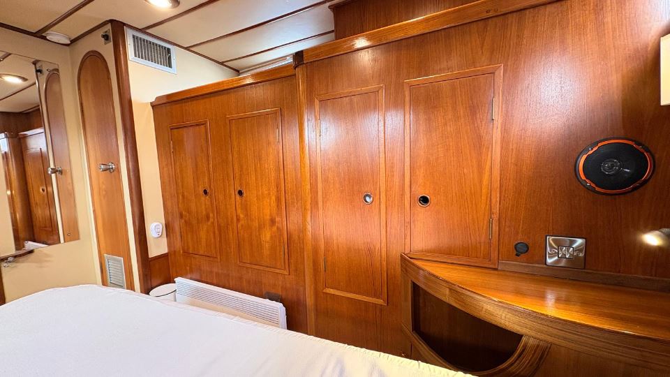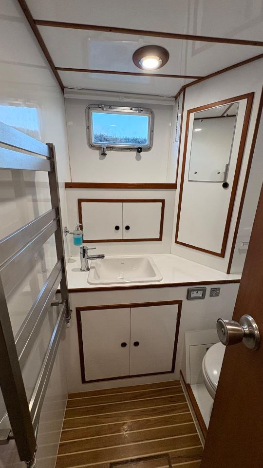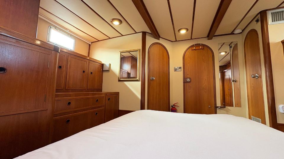 On deck, she is every inch the working sea boat – with high side-rails, plenty of robust handrails, and a practical command bridge area above the wheelhouse and aft cabin, offering excellent guest seating as well as stations for both helm and navigator. Her decks are sensibly laid in zero-maintenance simulated teak, and are broad, flat, and allow unimpeded movement around her ring deck, assuring a safe working environment for her crew.