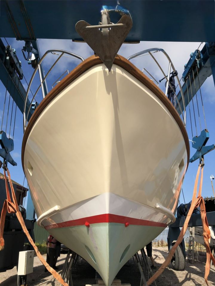 These vessels have also operated commercially as pilot boats (when neither weather nor sea state can prevent the pilot from getting on board), and feature a sharp forefoot with plenty of topside to deflect spray, all leading down to a pronounced deep keel. This offers protection to her stern gear and encourages straight tracking and precise steering through broken water in a way that lesser hulls cannot. The lay-up of her hull is mighty – and she proudly shows off her ribcage of structural frames, which brace her skin as she slices up-weather. As a proper cruising boat, this is what you need and want, rather than having your options clipped by a little adverse weather.