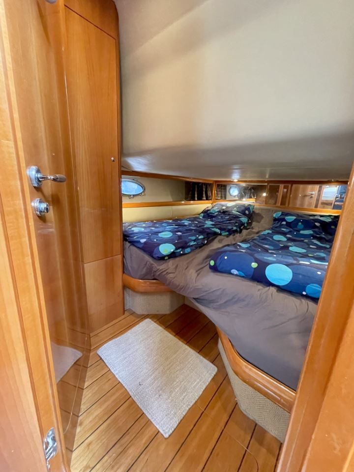 Below decks the interior is finished in high gloss cherry with leather panels and white headlining, creating a light and refined atmosphere typical of Windy. Two proper cabins and a practical saloon provide generous accommodation for family and guests. The hardtop cockpit, with its deep seating, wet bar and convertible sunbed arrangement, is one of the Grand Mistral’s greatest strengths and makes her equally suited to relaxed socialising, long distance cruising or fast passage making.