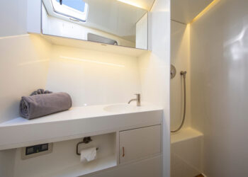 Guest cabins are forward, each with a full ensuite head and shower, a double berth and generous stowage.