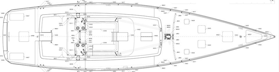 The chart area is aft of the seating area on the port side, with the crew cabin located aft again from there. The galley is aft of the saloon on the starboard side.